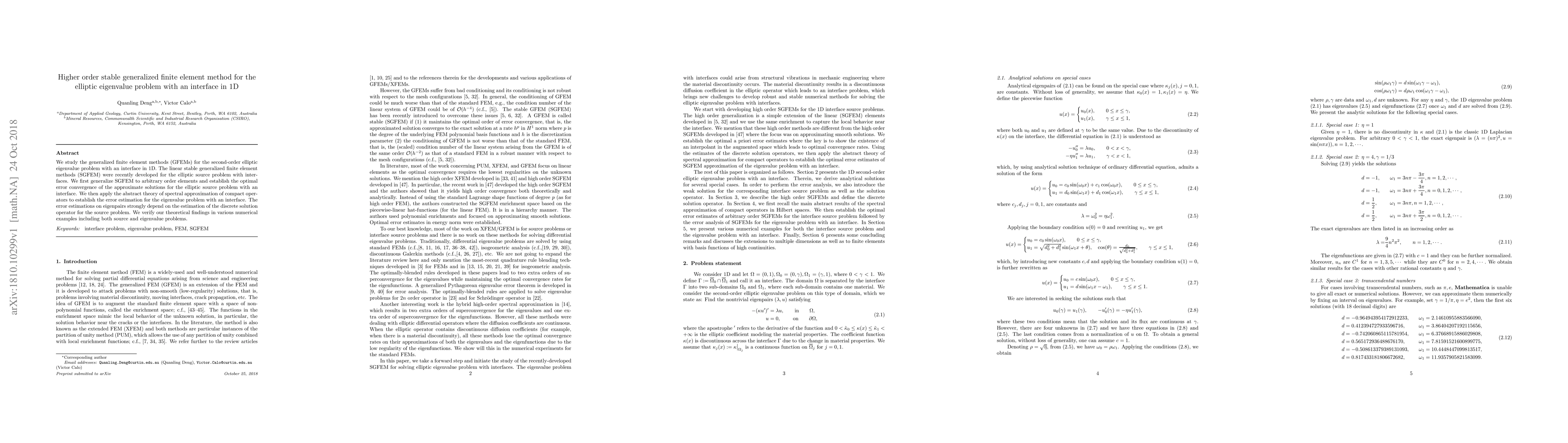 This paper develops a higher order stable generalized finite element method (SGFEM) for solving the elliptic eigenvalue problem in 1D with an interface. It generalizes linear SGFEM to arbitrary order elements and establishes optimal error convergence for both source and eigenvalue problems, validated by numerical examples.