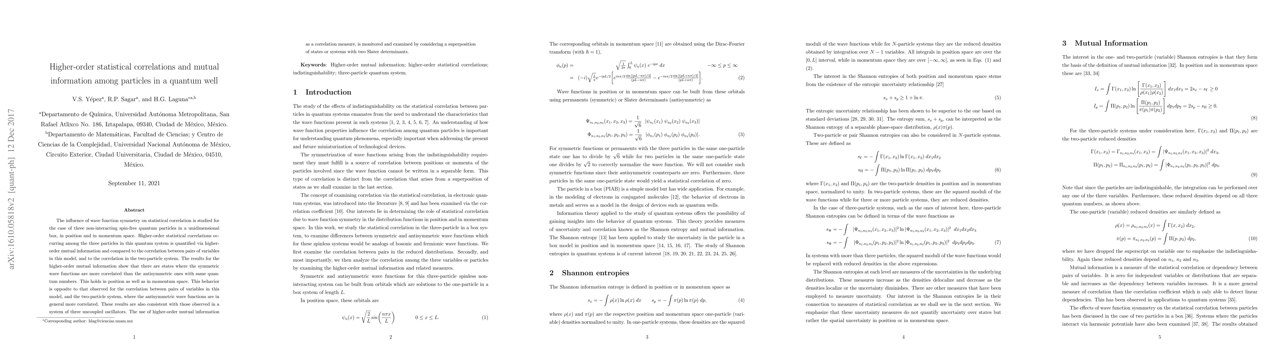 Research explores how symmetry in quantum wave functions affects correlations among particles in a box, finding that symmetric wave functions can be more correlated than antisymmetric ones for higher-order statistical measures.