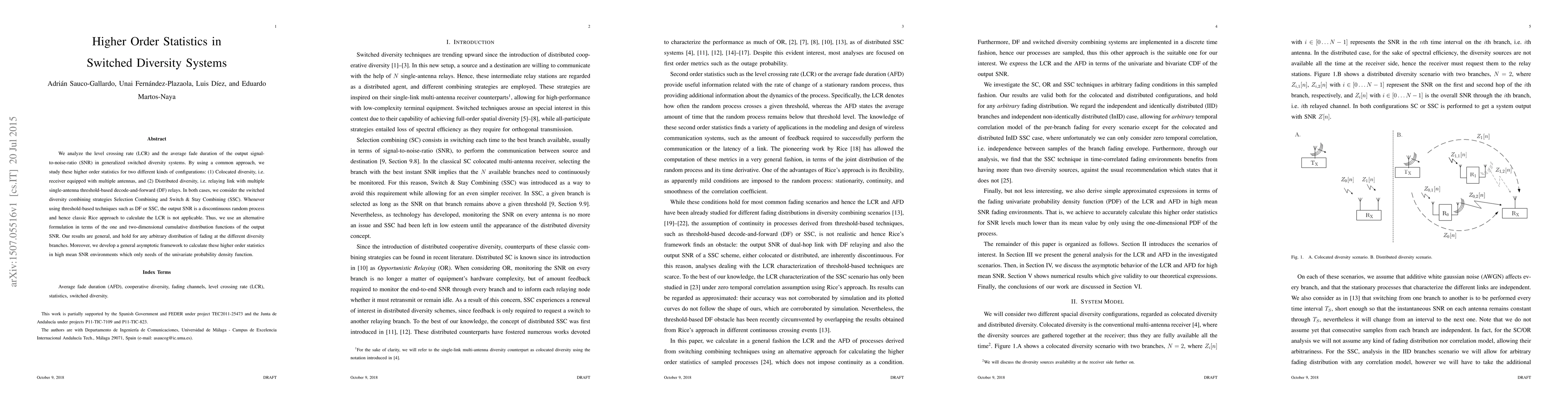 We analyze the level crossing rate (LCR) and the average fade duration of the output signal-to-noise-ratio (SNR) in generalized switched diversity systems. By using a common approach, we study these higher order statistics for two different kinds of configurations: (1) Colocated diversity, i.e. receiver equipped with multiple antennas, and (2) Distributed diversity, i.e. relaying link with multiple single-antenna threshold-based decode-and-forward (DF) relays. In both cases, we consider the switched diversity combining strategies Selection Combining and Switch \& Stay Combining (SSC). Whenever using threshold-based techniques such as DF or SSC, the output SNR is a discontinuous random process and hence classic Rice approach to calculate the LCR is not applicable. Thus, we use an alternative formulation in terms of the one and two-dimensional cumulative distribution functions of the output SNR. Our results are general, and hold for any arbitrary distribution of fading at the different diversity branches. Moreover, we develop a general asymptotic framework to calculate these higher order statistics in high mean SNR environments which only needs of the univariate probability density function.