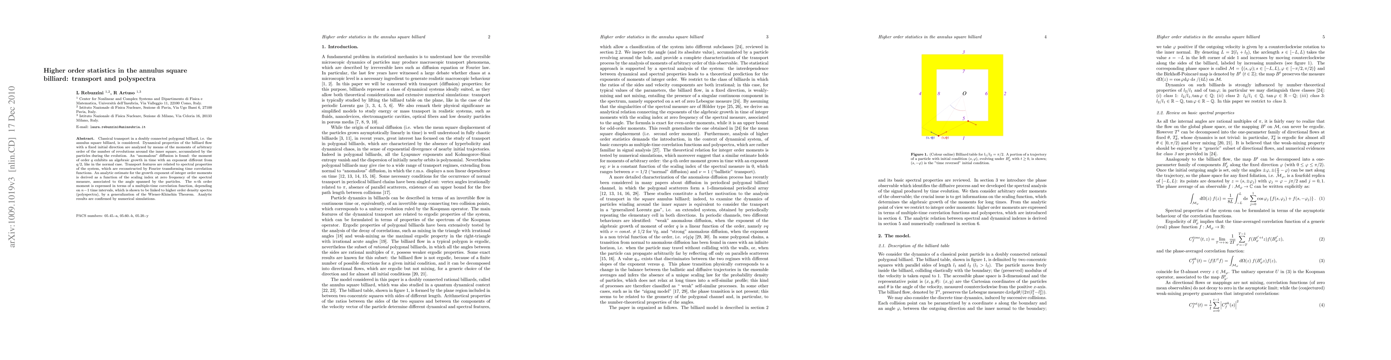 This research analyzes the 'anomalous' diffusion in a doubly connected polygonal billiard system, specifically the annulus square billiard. Using higher-order moments of revolutions, it discovers non-standard time growth exponents, linking these to spectral properties. The findings are supported by numerical simulations and an analytic expression for growth exponents based on spectral measures.