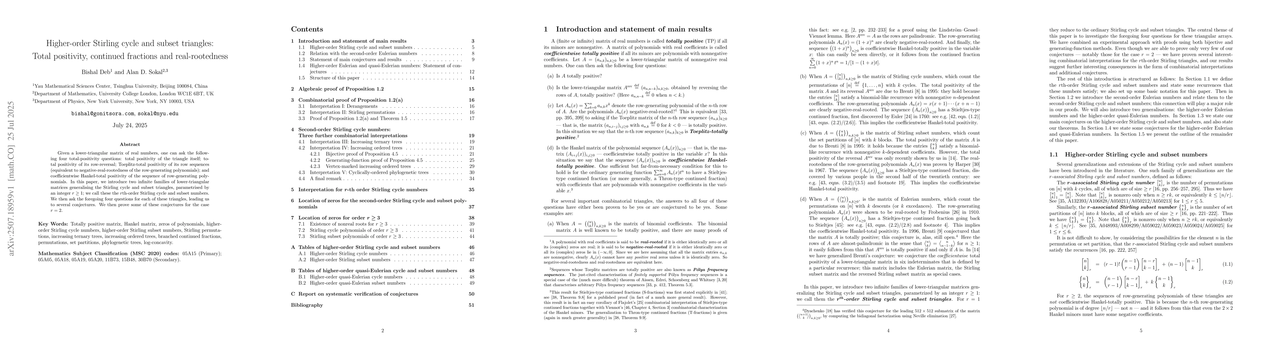 Given a lower-triangular matrix of real numbers, one can ask the following four total-positivity questions: total positivity of the triangle itself; total positivity of its row-reversal; Toeplitz-total positivity of its row sequences (equivalent to negative-real-rootedness of the row-generating polynomials); and coefficientwise Hankel-total positivity of the sequence of row-generating polynomials. In this paper, we introduce two infinite families of lower-triangular matrices generalising the Stirling cycle and subset triangles, parametrised by an integer $r \ge 1$; we call these the $r$th-order Stirling cycle and subset numbers. We then ask the foregoing four questions for each of these triangles, leading us to several conjectures. We then prove some of these conjectures for the case $r=2$.