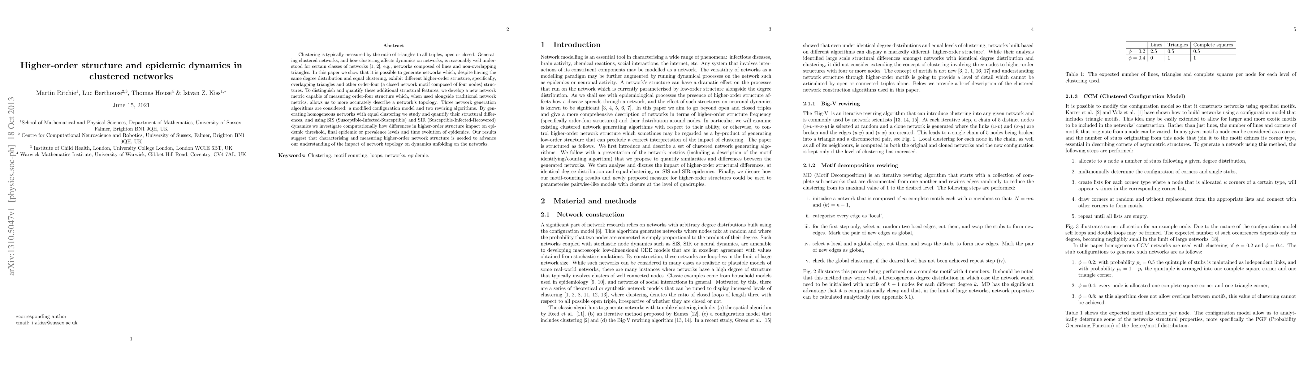 Clustering is typically measured by the ratio of triangles to all triples, open or closed. Generating clustered networks, and how clustering affects dynamics on networks, is reasonably well understood for certain classes of networks \cite{vmclust, karrerclust2010}, e.g., networks composed of lines and non-overlapping triangles. In this paper we show that it is possible to generate networks which, despite having the same degree distribution and equal clustering, exhibit different higher-order structure, specifically, overlapping triangles and other order-four (a closed network motif composed of four nodes) structures. To distinguish and quantify these additional structural features, we develop a new network metric capable of measuring order-four structure which, when used alongside traditional network metrics, allows us to more accurately describe a network's topology. Three network generation algorithms are considered: a modified configuration model and two rewiring algorithms. By generating homogeneous networks with equal clustering we study and quantify their structural differences, and using SIS (Susceptible-Infected-Susceptible) and SIR (Susceptible-Infected-Recovered) dynamics we investigate computationally how differences in higher-order structure impact on epidemic threshold, final epidemic or prevalence levels and time evolution of epidemics. Our results suggest that characterising and measuring higher-order network structure is needed to advance our understanding of the impact of network topology on dynamics unfolding on the networks.