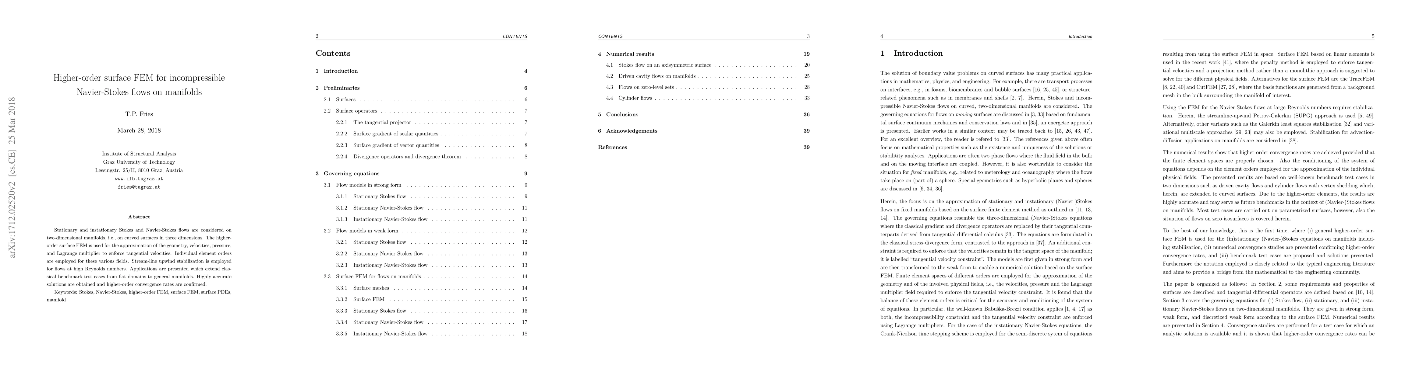 This paper presents a higher-order surface finite element method (FEM) to simulate incompressible Navier-Stokes flows on curved two-dimensional manifolds. The method achieves highly accurate solutions with confirmed higher-order convergence rates, extending classical benchmark tests to general manifolds.