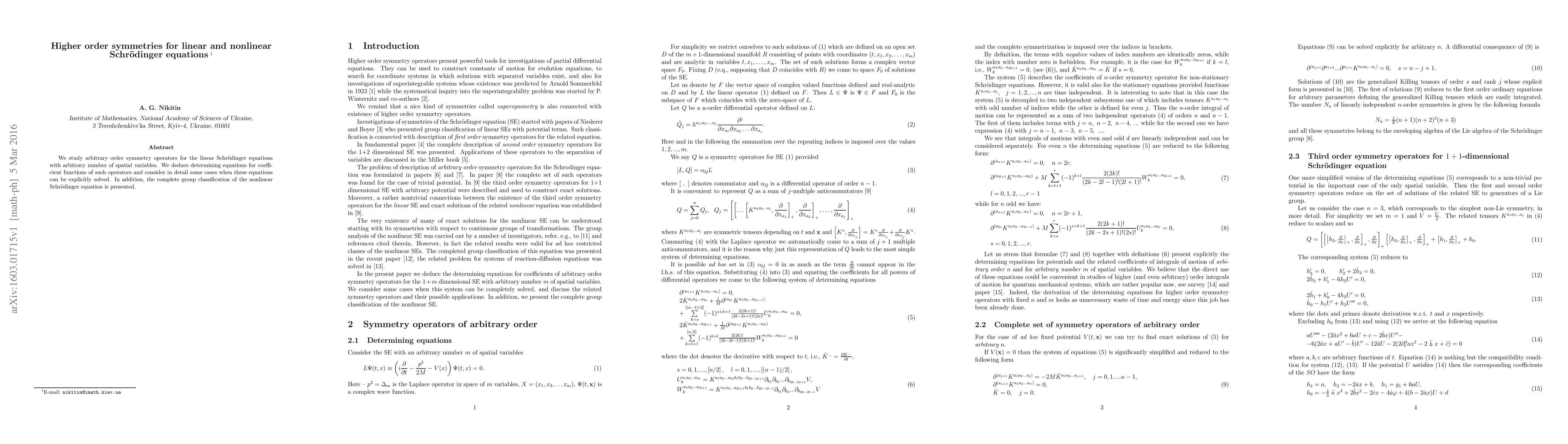 This research explores higher-order symmetry operators for linear Schrödinger equations with multiple spatial dimensions, deriving determining equations for their coefficients. It also provides explicit solutions for certain cases and presents a comprehensive group classification for nonlinear Schrödinger equations.