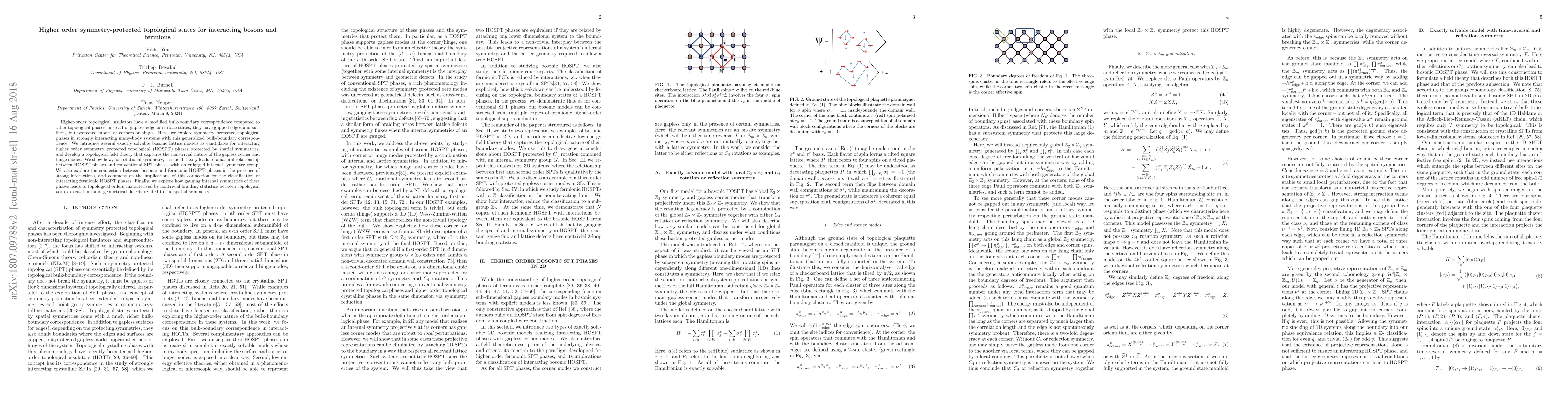 This paper investigates higher-order symmetry-protected topological (HOSPT) phases in strongly interacting bosonic and fermionic systems, introducing lattice models and a topological field theory to describe their unique corner and hinge modes. It highlights the relationship between HOSPT and conventional SPT phases, and discusses implications for fermionic HOSPT classification and topological orders from gauging internal symmetries.