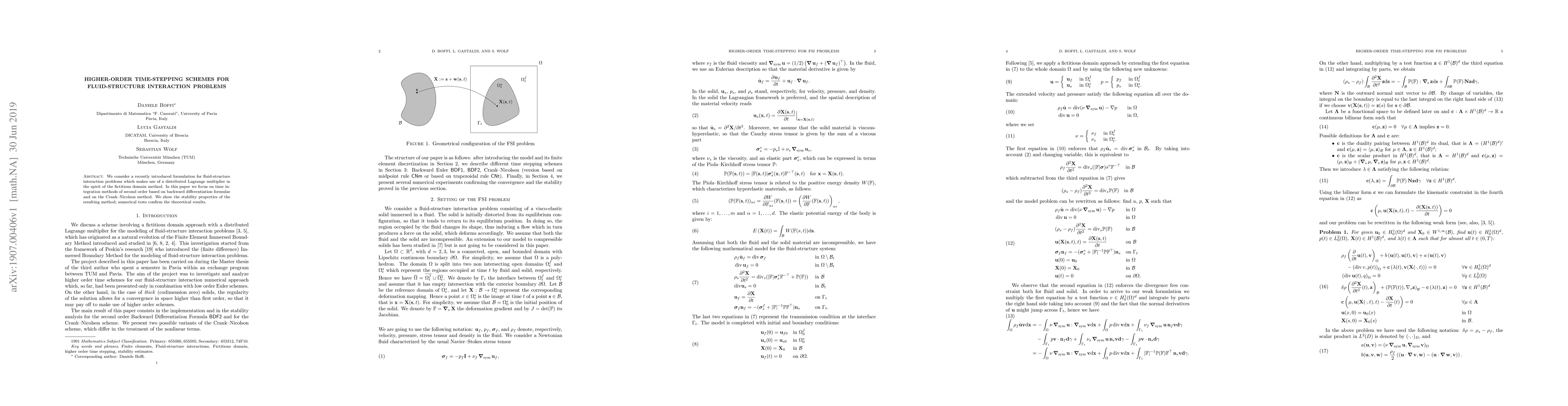 This paper explores second-order time integration methods for fluid-structure interaction problems using a distributed Lagrange multiplier approach. It evaluates stability properties and validates theoretical results with numerical tests.