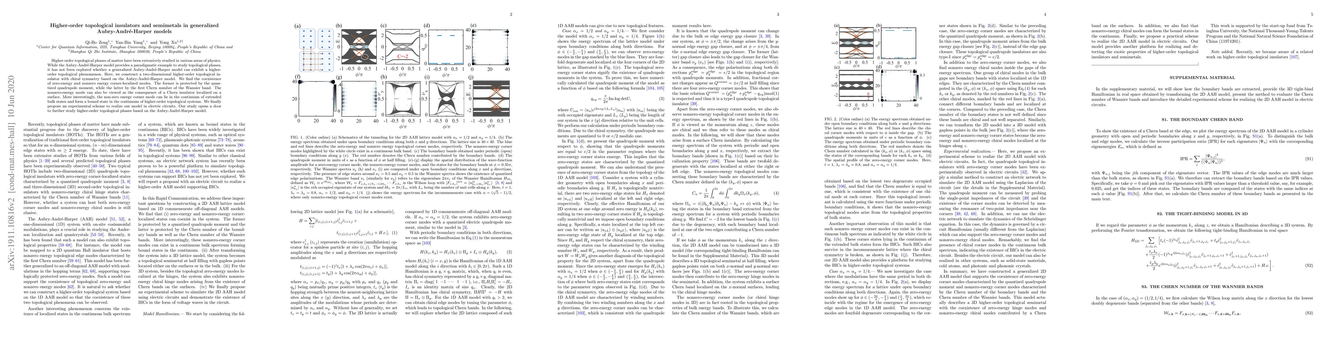 This paper constructs a two-dimensional higher-order topological insulator based on a generalized Aubry-Andr\'e-Harper model, revealing zero-energy and nonzero-energy corner-localized modes protected by different topological invariants. The study proposes an experimental realization in electric circuits, opening new avenues for higher-order topological phases research.