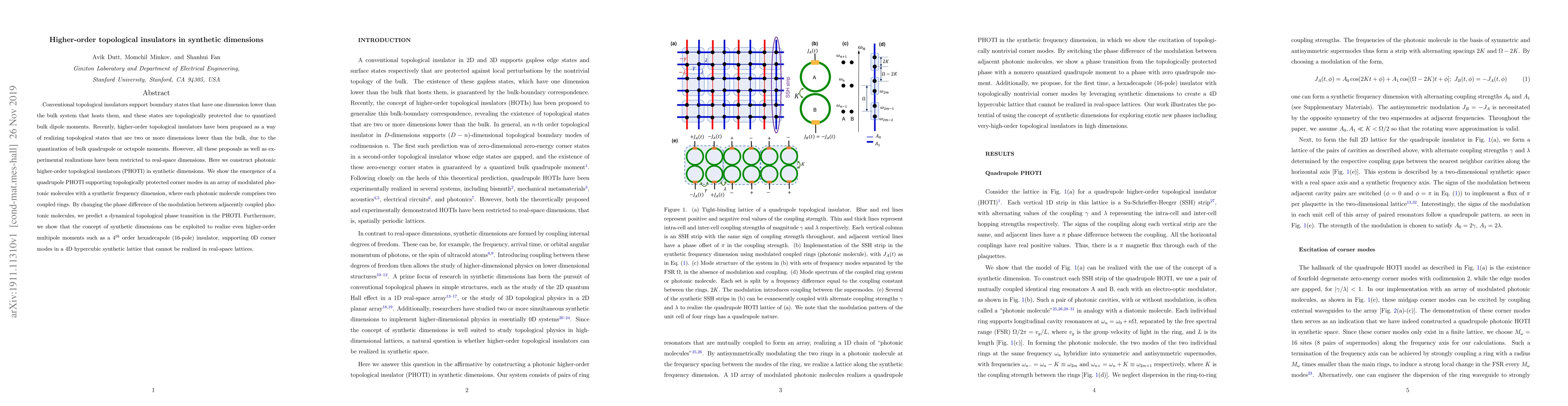 This paper introduces photonic higher-order topological insulators (PHOTI) in synthetic dimensions, demonstrating topologically protected corner modes from quadrupole moments in modulated photonic molecules. It also predicts a topological phase transition and extends the concept to a 4th order hexadecapole insulator supporting 0D corner modes in a 4D synthetic lattice.