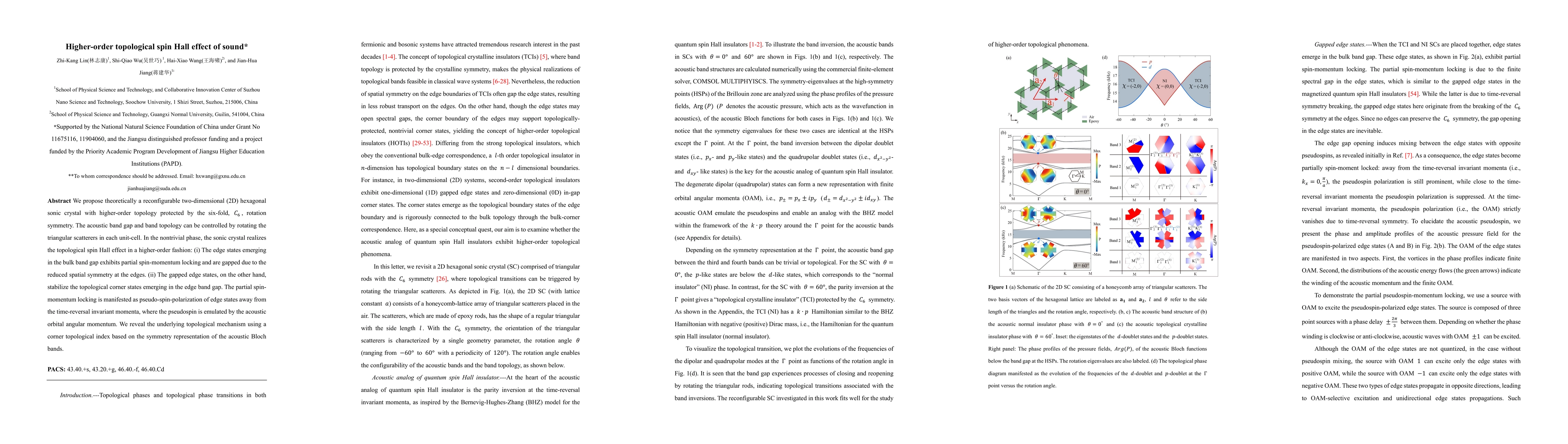 We propose theoretically a reconfigurable two-dimensional (2D) hexagonal sonic crystal with higher-order topology protected by the six-fold, $C_6$, rotation symmetry. The acoustic band gap and band topology can be controlled by rotating the triangular scatterers in each unit-cell. In the nontrivial phase, the sonic crystal realizes the topological spin Hall effect in a higher-order fashion: (i) The edge states emerging in the bulk band gap exhibits partial spin-momentum locking and are gapped due to the reduced spatial symmetry at the edges. (ii) The gapped edge states, on the other hand, stabilize the topological corner states emerging in the edge band gap. The partial spin-momentum locking is manifested as pseudo-spin-polarization of edge states away from the time-reversal invariant momenta, where the pseudospin is emulated by the acoustic orbital angular momentum. We reveal the underlying topological mechanism using a corner topological index based on the symmetry representation of the acoustic Bloch bands.