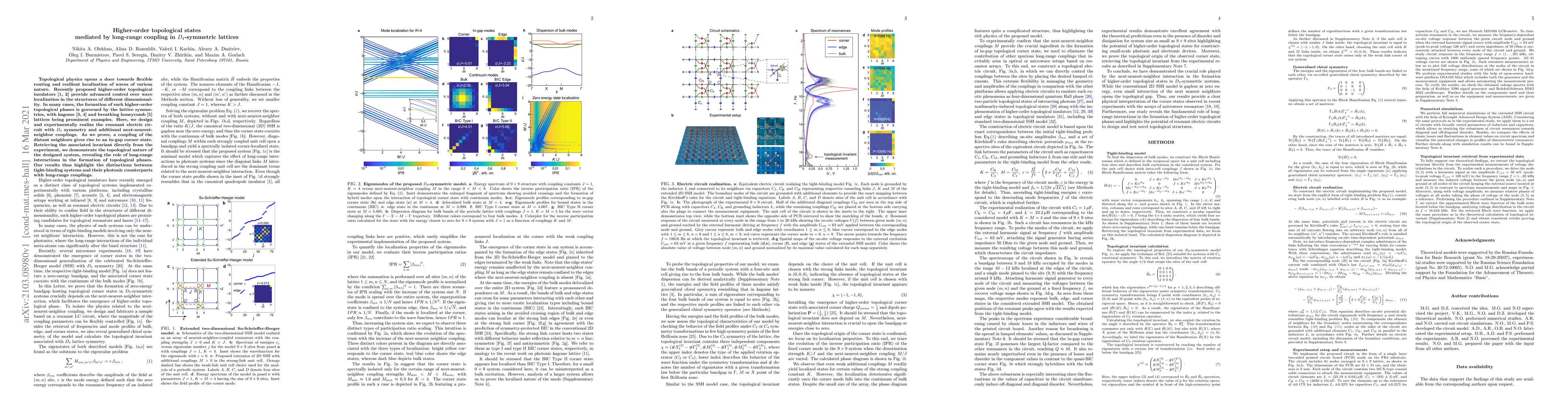 Topological physics opens a door towards flexible routing and resilient localization of waves of various nature. Recently proposed higher-order topological insulators provide advanced control over wave localization in the structures of different dimensionality. In many cases, the formation of such higher-order topological phases is governed by the lattice symmetries, with kagome and breathing honeycomb lattices being prominent examples. Here, we design and experimentally realize the resonant electric circuit with $D_4$ symmetry and additional next-nearest-neighbor couplings. As we prove, a coupling of the distant neighbors gives rise to an in-gap corner state. Retrieving the associated invariant directly from the experiment, we demonstrate the topological nature of the designed system, revealing the role of long-range interactions in the formation of topological phases. Our results thus highlight the distinctions between tight-binding systems and their photonic counterparts with long-range couplings.