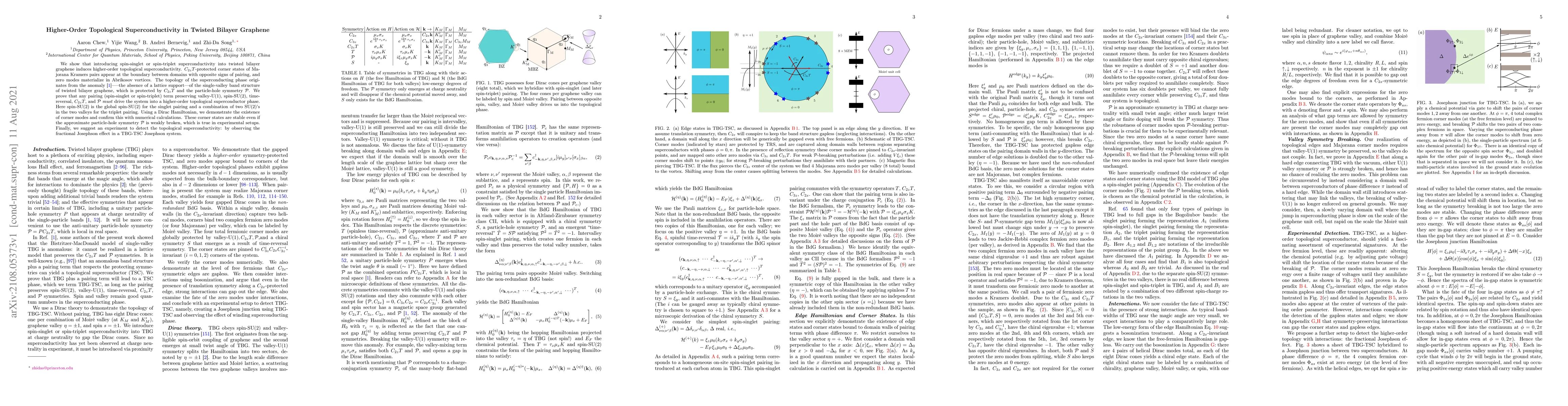 This paper demonstrates that twisted bilayer graphene exhibits higher-order topological superconductivity when coupled with spin-singlet or spin-triplet superconductivity, resulting in $C_{2z}T$-protected corner states and zero modes in vortices. The topological phase is protected by $C_{2z}T$ symmetry and particle-hole symmetry, with numerical evidence supporting the existence of these corner states, which remain stable under slight symmetry breaking.