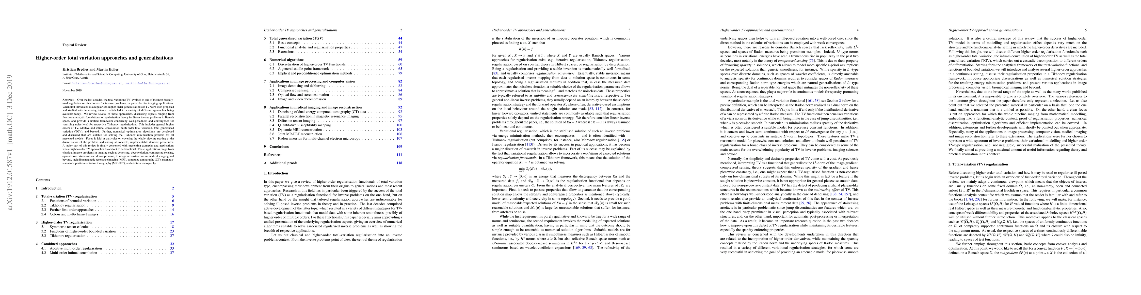 Over the last decades, the total variation (TV) evolved to one of the most broadly-used regularisation functionals for inverse problems, in particular for imaging applications. When first introduced as a regulariser, higher-order generalisations of TV were soon proposed and studied with increasing interest, which led to a variety of different approaches being available today. We review several of these approaches, discussing aspects ranging from functional-analytic foundations to regularisation theory for linear inverse problems in Banach space, and provide a unified framework concerning well-posedness and convergence for vanishing noise level for respective Tikhonov regularisation. This includes general higher orders of TV, additive and infimal-convolution multi-order total variation, total generalised variation (TGV), and beyond. Further, numerical optimisation algorithms are developed and discussed that are suitable for solving the Tikhonov minimisation problem for all presented models. Focus is laid in particular on covering the whole pipeline starting at the discretisation of the problem and ending at concrete, implementable iterative procedures. A major part of this review is finally concerned with presenting examples and applications where higher-order TV approaches turned out to be beneficial. These applications range from classical inverse problems in imaging such as denoising, deconvolution, compressed sensing, optical-flow estimation and decompression, to image reconstruction in medical imaging and beyond, including magnetic resonance imaging (MRI), computed tomography (CT), magnetic-resonance positron emission tomography (MR-PET), and electron tomography.