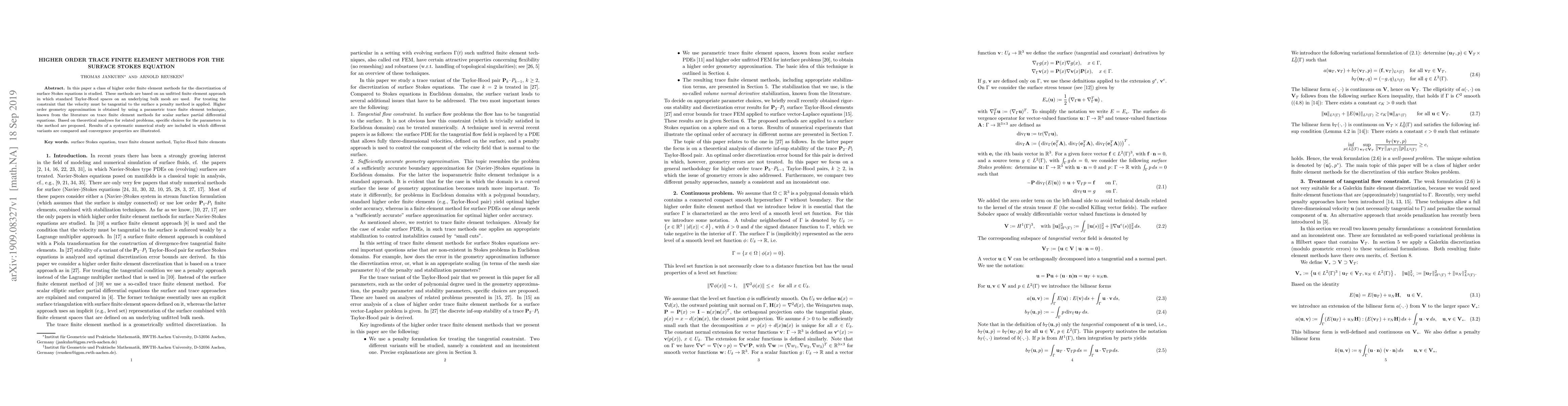 The proposed method combines standard Taylor-Hood spaces with a parametric trace finite element technique and incorporates a penalty method to enforce tangential velocity constraint.