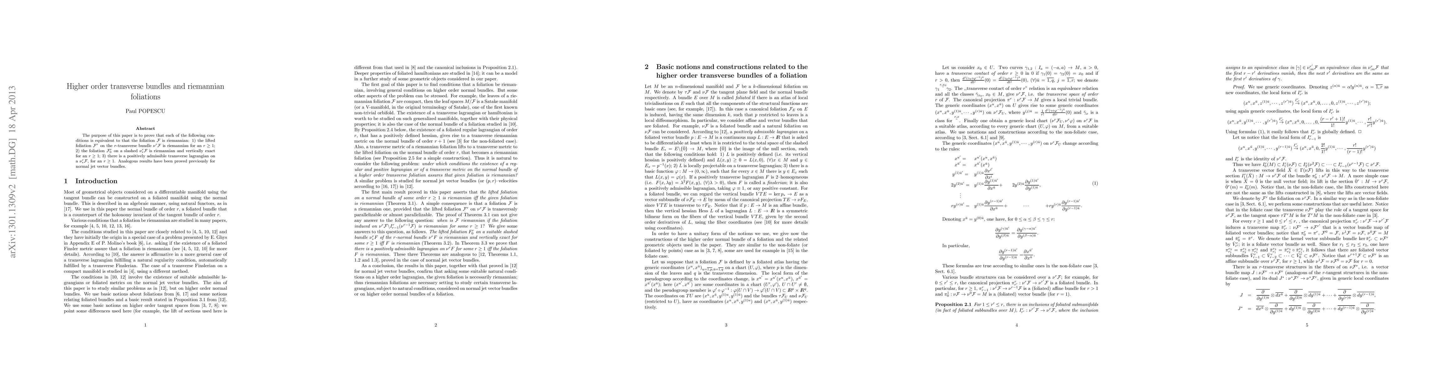 The purpose of this paper is to prove that each of the following conditions is equivalent to that the foliation ${\cal F}$ is riemannian: 1) the lifted foliation ${\cal F}^{r}$ on the $r$-transverse bundle $\nu ^{r}{\cal F}$ is riemannian for an $r\geq 1$; 2) the foliation ${\cal F}_{0}^{r}$ on a slashed $\nu_{\ast}^{r}{\cal F}$ is riemannian and vertically exact for an $r\geq 1$; 3) there is a positively admissible transverse lagrangian on a $\nu_{\ast}^{r}{\cal F}$, for an $r\geq 1$. Analogous results have been proved previously for normal jet vector bundles.