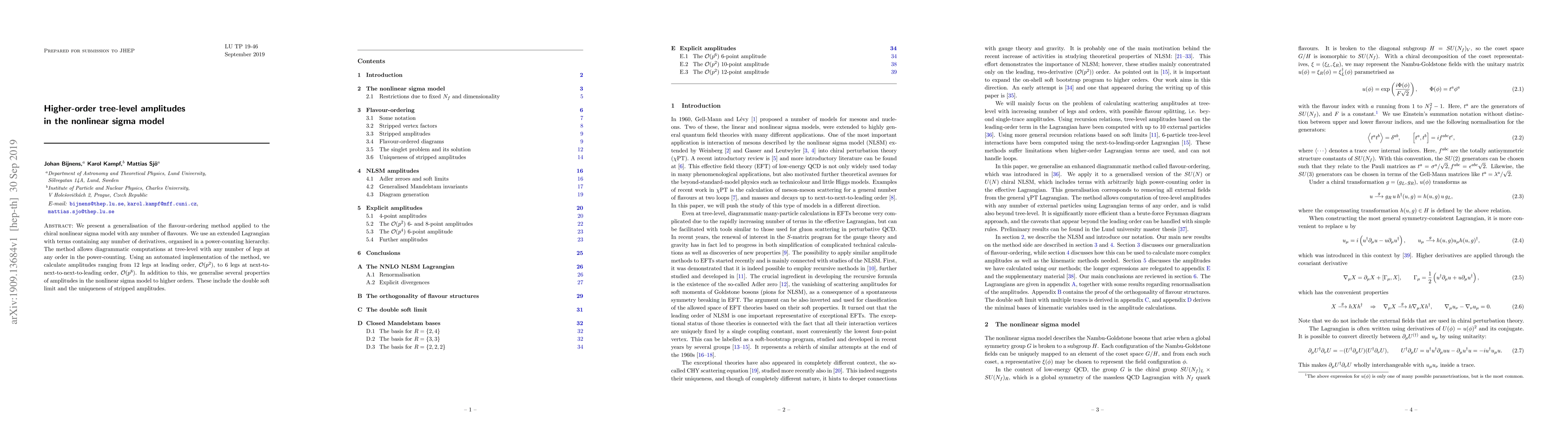 We present a generalisation of the flavour-ordering method applied to the chiral nonlinear sigma model with any number of flavours. We use an extended Lagrangian with terms containing any number of derivatives, organised in a power-counting hierarchy. The method allows diagrammatic computations at tree-level with any number of legs at any order in the power-counting. Using an automated implementation of the method, we calculate amplitudes ranging from 12 legs at leading order, $\mathcal{O}(p^2)$, to 6 legs at next-to-next-to-next-to-leading order, $\mathcal{O}(p^8)$. In addition to this, we generalise several properties of amplitudes in the nonlinear sigma model to higher orders. These include the double soft limit and the uniqueness of stripped amplitudes.