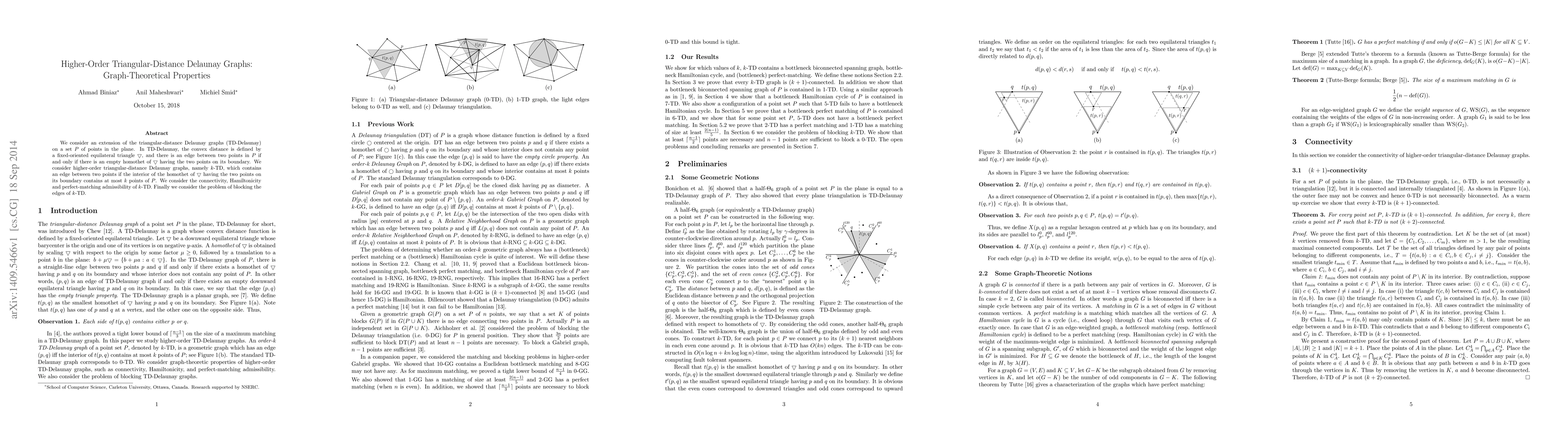 We consider an extension of the triangular-distance Delaunay graphs (TD-Delaunay) on a set $P$ of points in the plane. In TD-Delaunay, the convex distance is defined by a fixed-oriented equilateral triangle $\triangledown$, and there is an edge between two points in $P$ if and only if there is an empty homothet of $\triangledown$ having the two points on its boundary. We consider higher-order triangular-distance Delaunay graphs, namely $k$-TD, which contains an edge between two points if the interior of the homothet of $\triangledown$ having the two points on its boundary contains at most $k$ points of $P$. We consider the connectivity, Hamiltonicity and perfect-matching admissibility of $k$-TD. Finally we consider the problem of blocking the edges of $k$-TD.