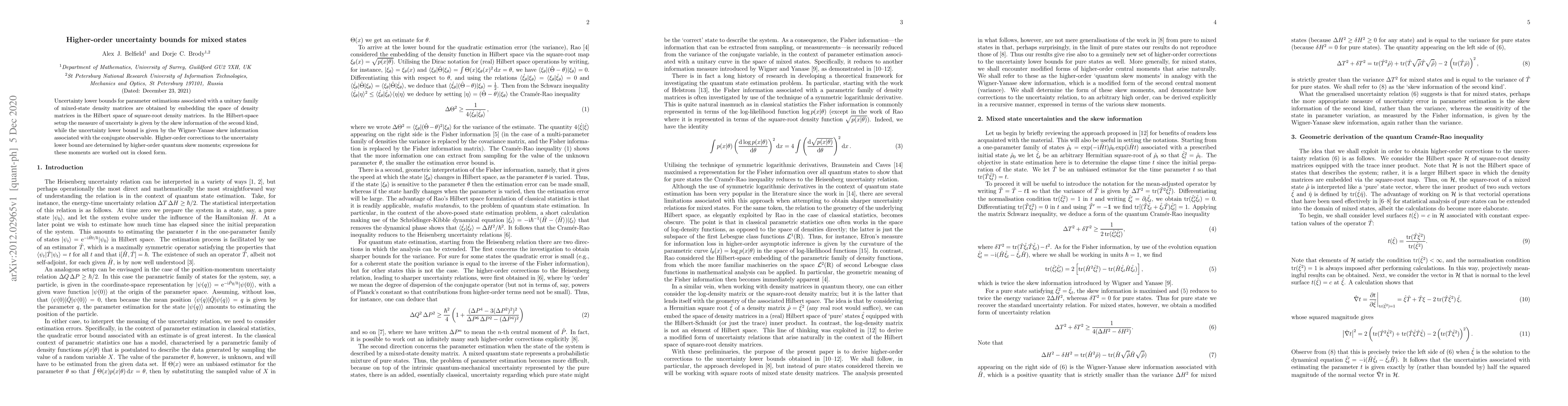 Uncertainty lower bounds for parameter estimations associated with a unitary family of mixed-state density matrices are obtained by embedding the space of density matrices in the Hilbert space of square-root density matrices. In the Hilbert-space setup the measure of uncertainty is given by the skew information of the second kind, while the uncertainty lower bound is given by the Wigner-Yanase skew information associated with the conjugate observable. Higher-order corrections to the uncertainty lower bound are determined by higher-order quantum skew moments; expressions for these moments are worked out in closed form.