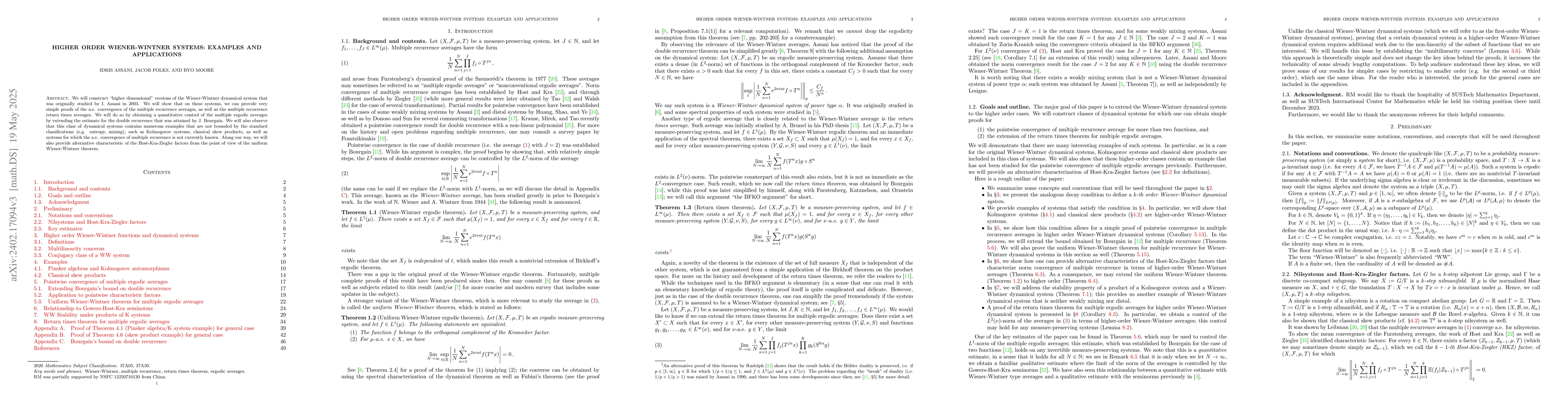 The notion of a Wiener-Wintner dynamical system provides a simple proof of pointwise convergence for double recurrence in the case where the Wiener-Wintner averages converge to zero at a polynomial rate for a dense set of functions that lie outside the Kronecker factor. This follows by exploiting a bound that arises in the beginning of Bourgain argument for double recurrence. We extend this bound to triple and higher recurrence and define the notion of a higher order Wiener-Wintner dynamical system, in which pointwise convergence of higher recurrence follows by a similar simple argument. We provide examples of dynamical systems that satisfy this condition, and also show how the higher order Wiener-Wintner averaging condition can provide an alternative characterization of Host-Kra-Ziegler factors. We will also provide a proof of the return times theorem for multiple recurrence for this class of systems.