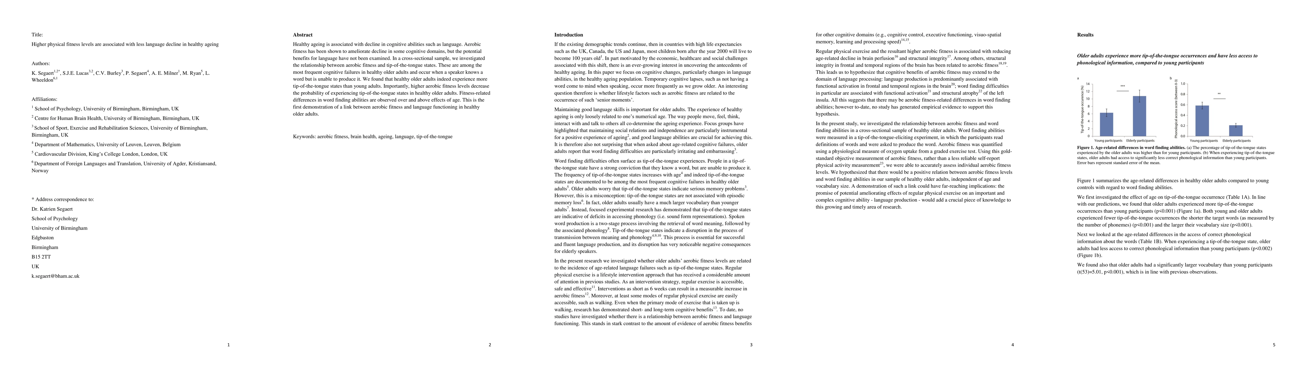 Healthy ageing is associated with decline in cognitive abilities such as language. Aerobic fitness has been shown to ameliorate decline in some cognitive domains, but the potential benefits for language have not been examined. In a cross-sectional sample, we investigated the relationship between aerobic fitness and tip-of-the-tongue states. These are among the most frequent cognitive failures in healthy older adults and occur when a speaker knows a word but is unable to produce it. We found that healthy older adults indeed experience more tip-of-the-tongue states than young adults. Importantly, higher aerobic fitness levels decrease the probability of experiencing tip-of-the-tongue states in healthy older adults. Fitness-related differences in word finding abilities are observed over and above effects of age. This is the first demonstration of a link between aerobic fitness and language functioning in healthy older adults.