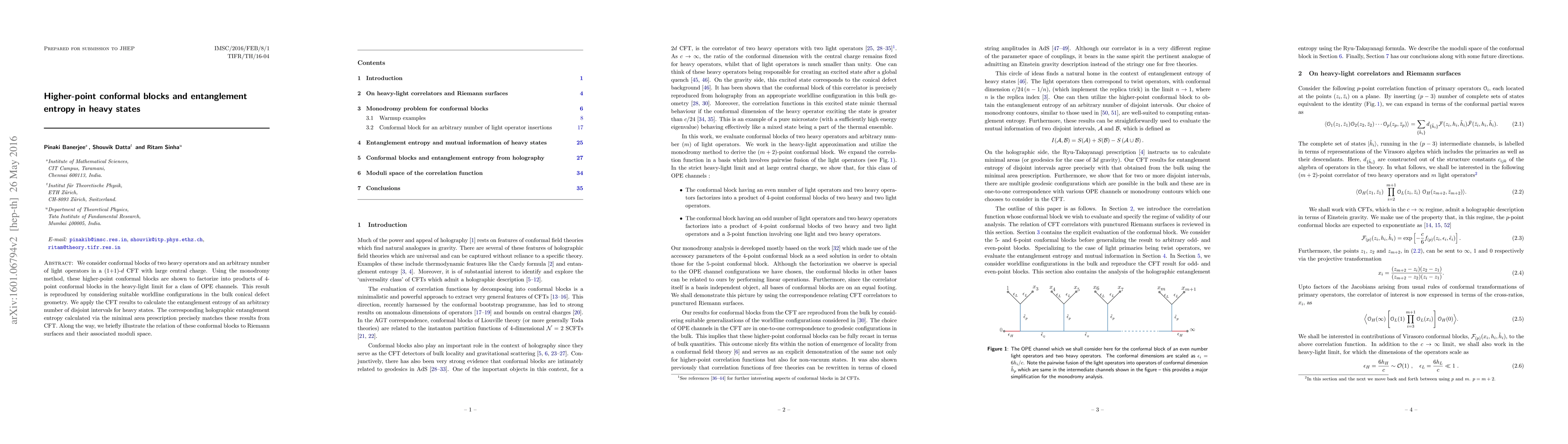 We consider conformal blocks of two heavy operators and an arbitrary number of light operators in a (1+1)-d CFT with large central charge. Using the monodromy method, these higher-point conformal blocks are shown to factorize into products of 4-point conformal blocks in the heavy-light limit for a class of OPE channels. This result is reproduced by considering suitable worldline configurations in the bulk conical defect geometry. We apply the CFT results to calculate the entanglement entropy of an arbitrary number of disjoint intervals for heavy states. The corresponding holographic entanglement entropy calculated via the minimal area prescription precisely matches these results from CFT. Along the way, we briefly illustrate the relation of these conformal blocks to Riemann surfaces and their associated moduli space.