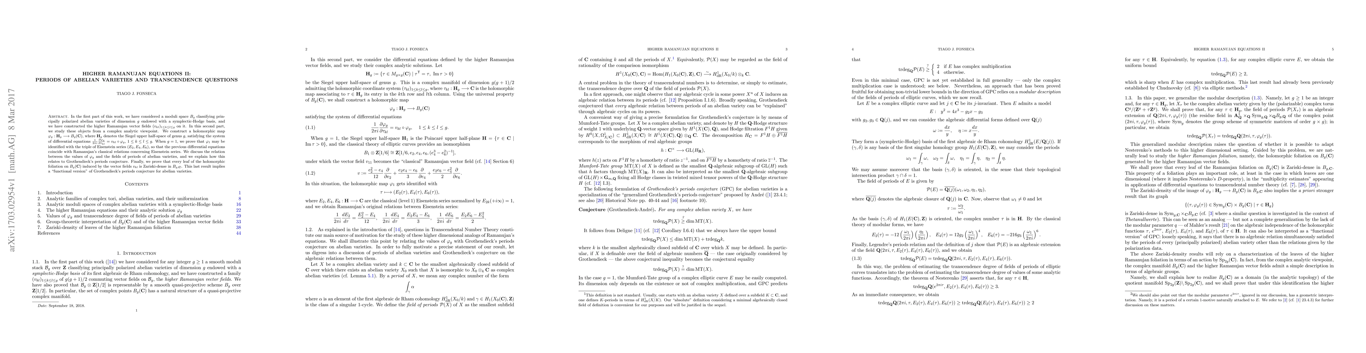 This paper constructs higher Ramanujan vector fields on a moduli space of abelian varieties and explores their differential equations. It establishes a holomorphic map connecting the Siegel upper half-space to the moduli space, proving that this map corresponds to Ramanujan's relations for $g=1$. The study also ties these constructions to Grothendieck's periods conjecture and shows that the vector fields induce Zariski-dense leaves, supporting a functional version of the conjecture.