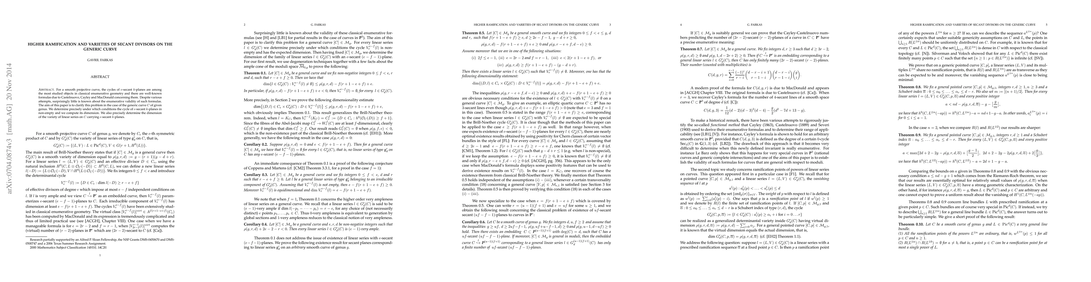 This paper investigates the enumerative geometry of e-secant k-planes on a generic smooth projective curve C of a given genus, using degeneration techniques and birational geometry. It determines the conditions for the existence and computes the dimension of the cycles of e-secant k-planes and the variety of linear series on C carrying them, while also examining the distribution of ramification points of line bundle powers on C.