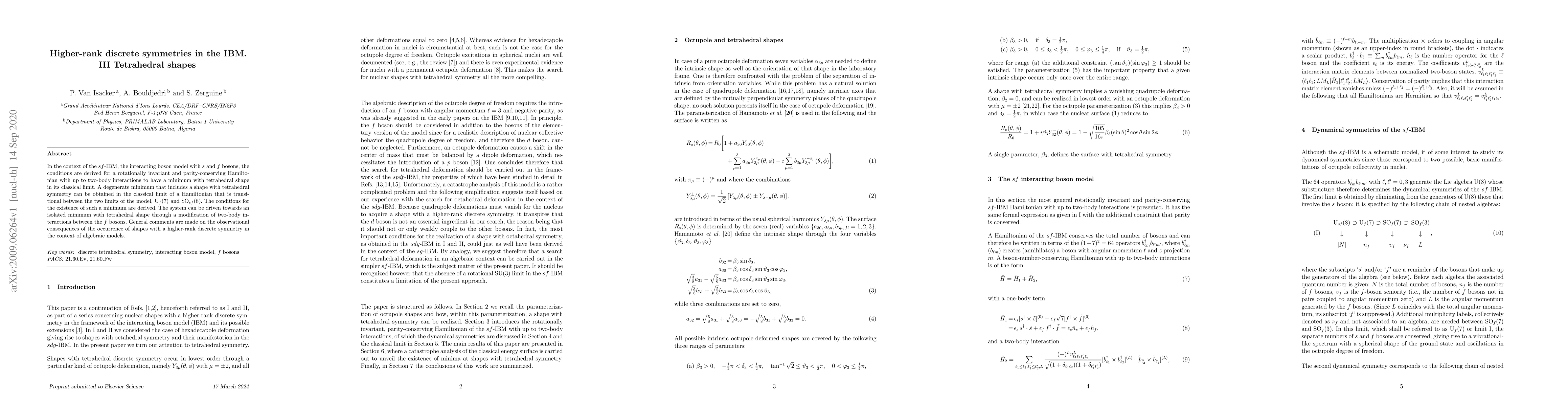 This research derives conditions for a rotationally invariant Hamiltonian in the interacting boson model with s and f bosons to exhibit a tetrahedral shape in its classical limit. It identifies a transitional Hamiltonian between U_f(7) and SO_{sf}(8) that allows for a degenerate minimum with tetrahedral symmetry, suggesting a method to stabilize such a shape via modified f-boson interactions. The study also discusses observational implications of higher-rank discrete symmetries in algebraic models.