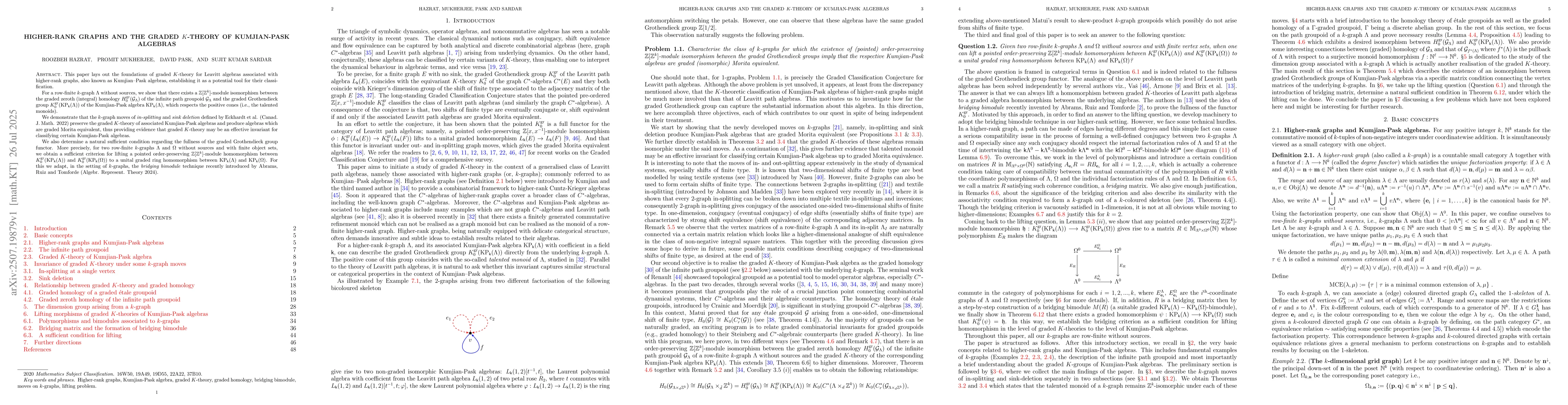This paper lays out the foundations of graded $K$-theory for Leavitt algebras associated with higher-rank graphs, also known as Kumjian-Pask algebras, establishing it as a potential tool for their classification. For a row-finite $k$-graph $\Lambda$ without sources, we show that there exists a $\mathbb{Z}[\mathbb{Z}^k]$-module isomorphism between the graded zeroth (integral) homology $H_0^{gr}(\mathcal{G}_\Lambda)$ of the infinite path groupoid $\mathcal{G}_\Lambda$ and the graded Grothendieck group $K_0^{gr}(KP_\mathsf{k}(\Lambda))$ of the Kumjian-Pask algebra $KP_\mathsf{k}(\Lambda)$, which respects the positive cones (i.e., the talented monoids). We demonstrate that the $k$-graph moves of in-splitting and sink deletion defined by Eckhardt et al. (Canad. J. Math. 2022) preserve the graded $K$-theory of associated Kumjian-Pask algebras and produce algebras which are graded Morita equivalent, thus providing evidence that graded $K$-theory may be an effective invariant for classifying certain Kumjian-Pask algebras. We also determine a natural sufficient condition regarding the fullness of the graded Grothendieck group functor. More precisely, for two row-finite $k$-graphs $\Lambda$ and $\Omega$ without sources and with finite object sets, we obtain a sufficient criterion for lifting a pointed order-preserving $\mathbb{Z}[\mathbb{Z}^k]$-module homomorphism between $K_0^{gr}(KP_\mathsf{k}(\Lambda))$ and $K_0^{gr}(KP_\mathsf{k}(\Omega))$ to a unital graded ring homomorphism between $KP_\mathsf{k}(\Lambda)$ and $KP_\mathsf{k}(\Omega)$. For this we adapt, in the setting of $k$-graphs, the bridging bimodule technique recently introduced by Abrams, Ruiz and Tomforde (Algebr. Represent. Theory 2024).