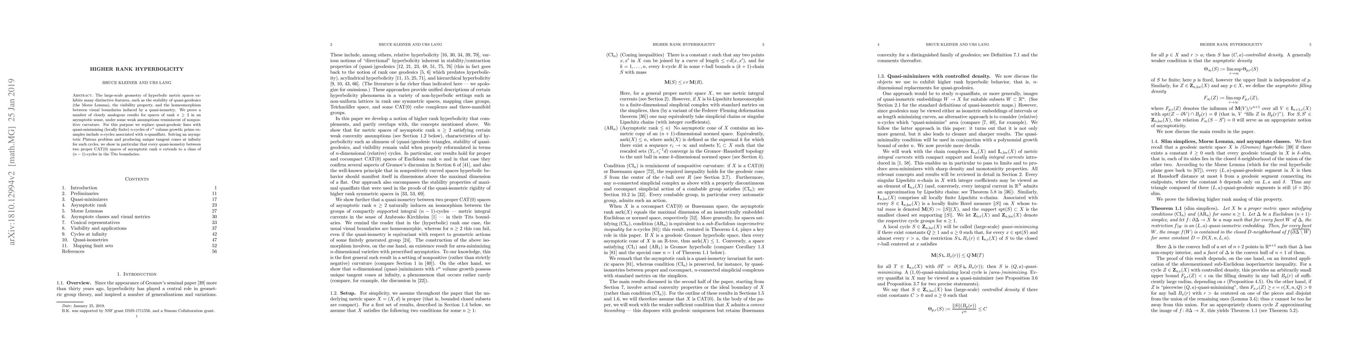 This paper studies the geometry of hyperbolic metric spaces with rank $n ge 2$, proving several analogous results to those in low-rank hyperbolic spaces, including stability of quasi-minimizing cycles and extension of quasi-isometries to higher-dimensional cycles.