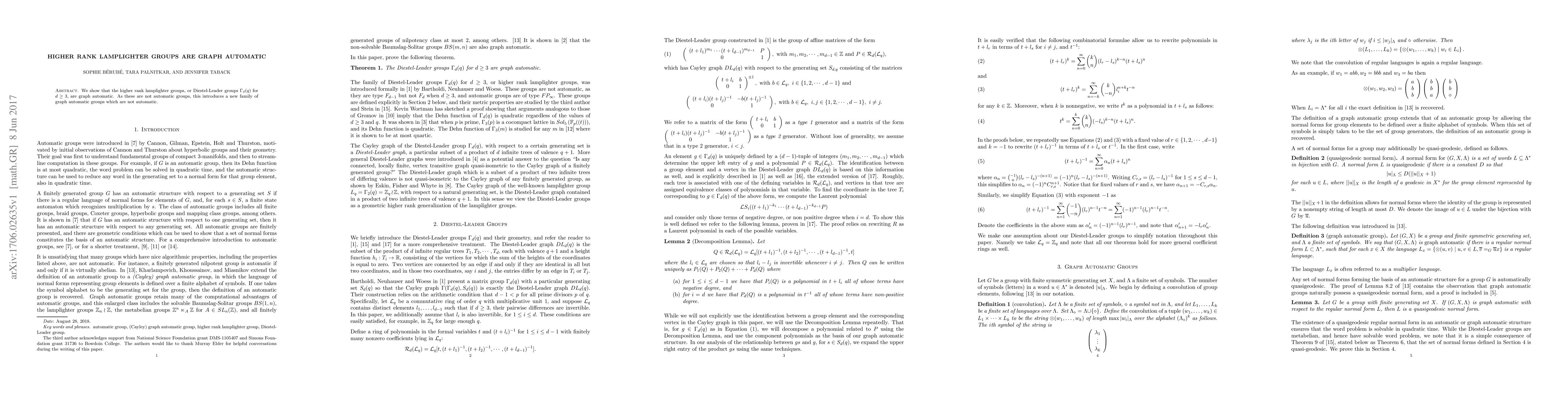 The paper demonstrates that higher rank lamplighter groups, specifically the Diestel-Leader groups $\Gamma_d(q)$ for $d \geq 3$, possess graph automatic properties, marking them as a novel family of graph automatic groups that are not traditional automatic groups.