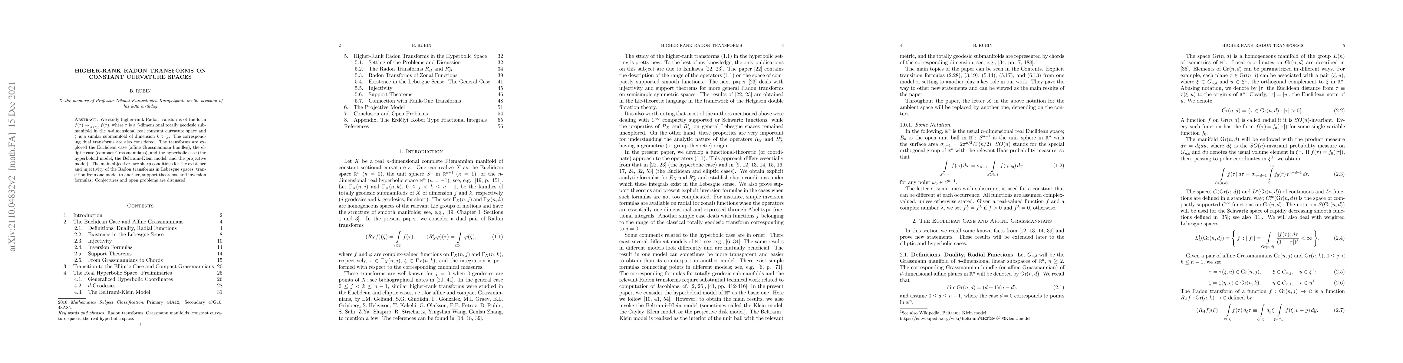 This paper investigates higher-rank Radon transforms on spaces of constant curvature, focusing on their existence, injectivity, and inversion in various models, including Euclidean, elliptic, and hyperbolic cases. It also explores dual transforms and presents conjectures and open problems regarding support theorems and transitions between different models.