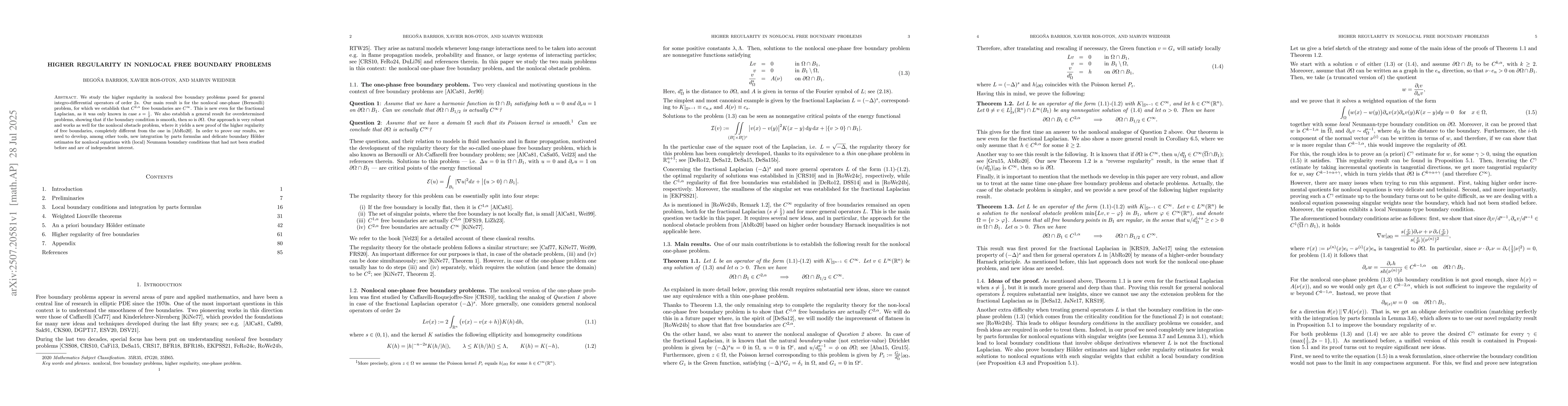 This research establishes that free boundaries in nonlocal one-phase (Bernoulli) problems, including the fractional Laplacian case, are infinitely differentiable (C∞) when boundary conditions are smooth. The study also presents a new approach for proving higher regularity in nonlocal obstacle problems, distinct from previous methods. It introduces novel integration by parts formulas and boundary Hölder estimates for nonlocal equations with Neumann boundary conditions, which are of broader interest.