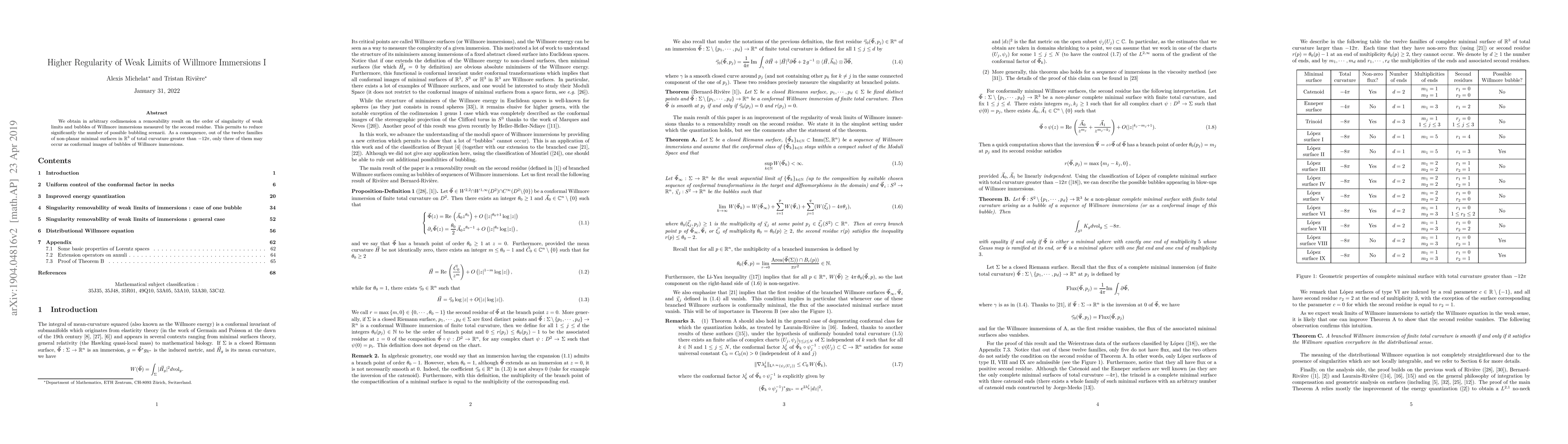 We obtain in arbitrary codimension a removability result on the order of singularity of weak limits and bubbles of Willmore immersions measured by the second residue. This permits to reduce significantly the number of possible bubbling scenarii. As a consequence, out of the twelve families of non-planar minimal surfaces in $\mathbb{R}^3$ of total curvature greater than $-12\pi$, only three of them may occur as conformal images of bubbles of Willmore immersions.