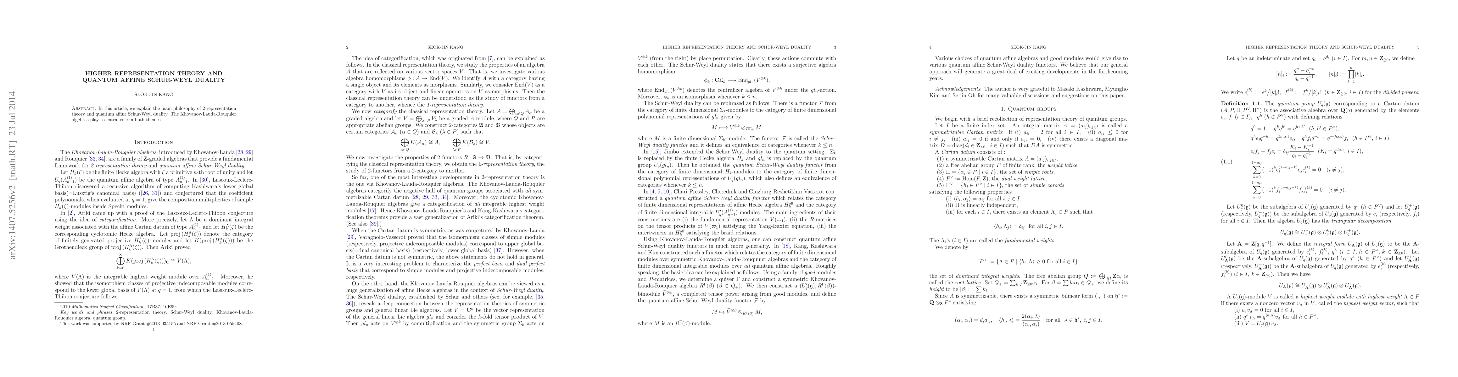In this article, we explain the main philosophy of 2-representation theory and quantum affine Schur-Weyl duality. The Khovanov-Lauda-Rouquier algebras play a central role in both themes.