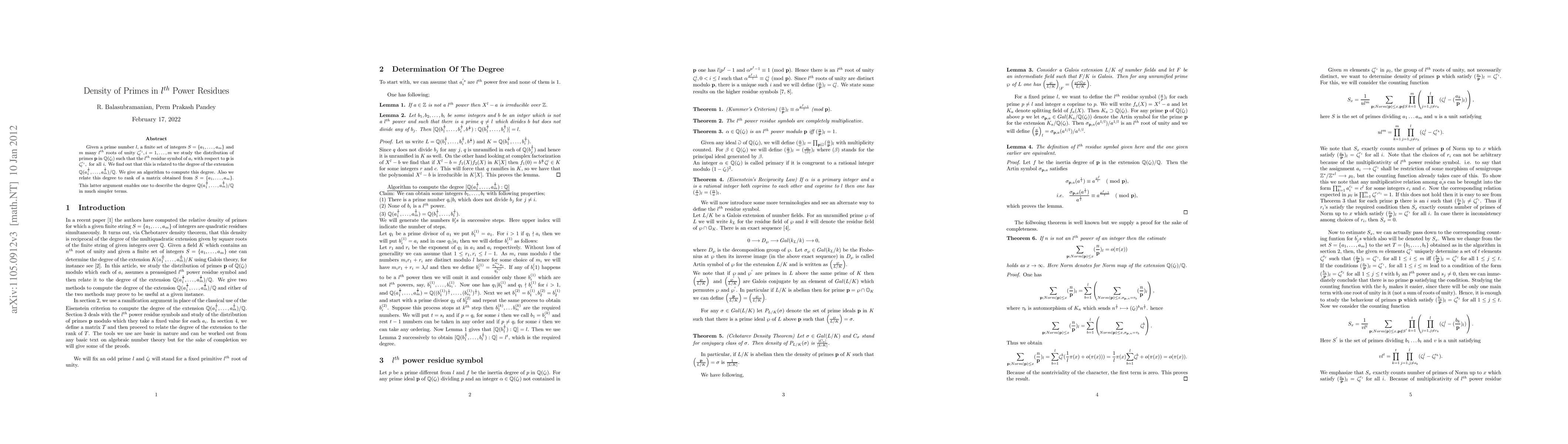 Given a prime number $l$ and a finite set of integers $S=\{a_1,...,a_m\}$ we find out the exact degree of the extension $\mathbb{Q}(a_1^{\frac{1}{l}},...,a_m^{\frac{1}{l}})/\mathbb{Q}$. We give an algorithm to compute this degree and then further relate it to the study of the distribution of primes $p$ for which all of $a_i$ assume a preassigned $l^{th}$ power residue simultaneously. Also we relate this degree to rank of a matrix obtained from $S=\{a_1,...,a_m\}$. This latter arguement enable one to describe the degree $\mathbb{Q}(a_1^{\frac{1}{l}},...,a_m^{\frac{1}{l}})/\mathbb{Q}$ in much simpler terms.