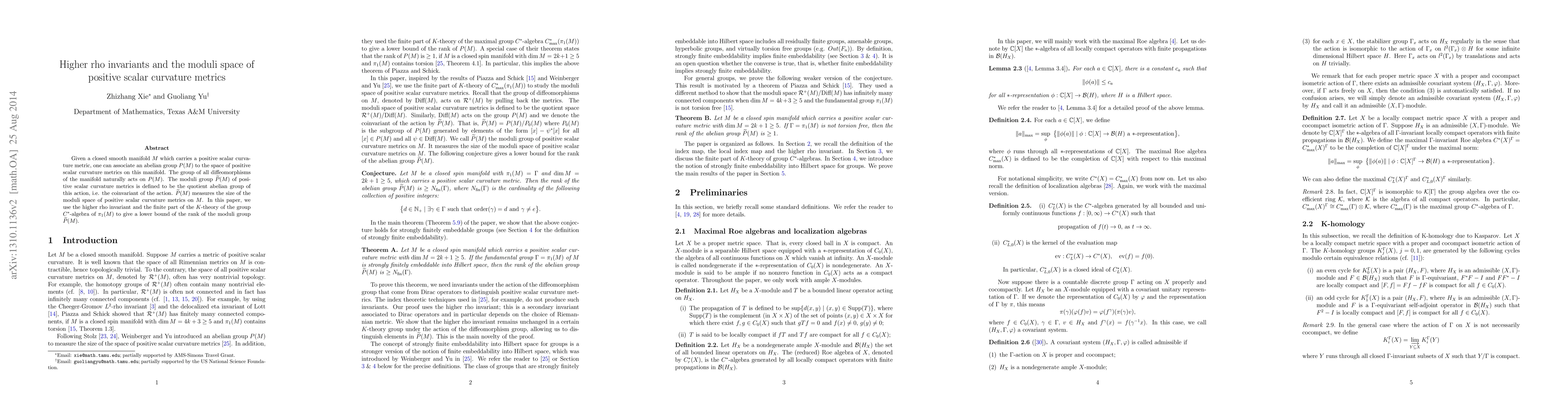 This paper investigates the moduli space of positive scalar curvature metrics on a closed smooth manifold M, defining the moduli group via the action of diffeomorphisms on the space of such metrics. It provides a lower bound for the rank of this moduli group using higher rho invariants and the finite part of the K-theory of the group C*-algebra of M's fundamental group.