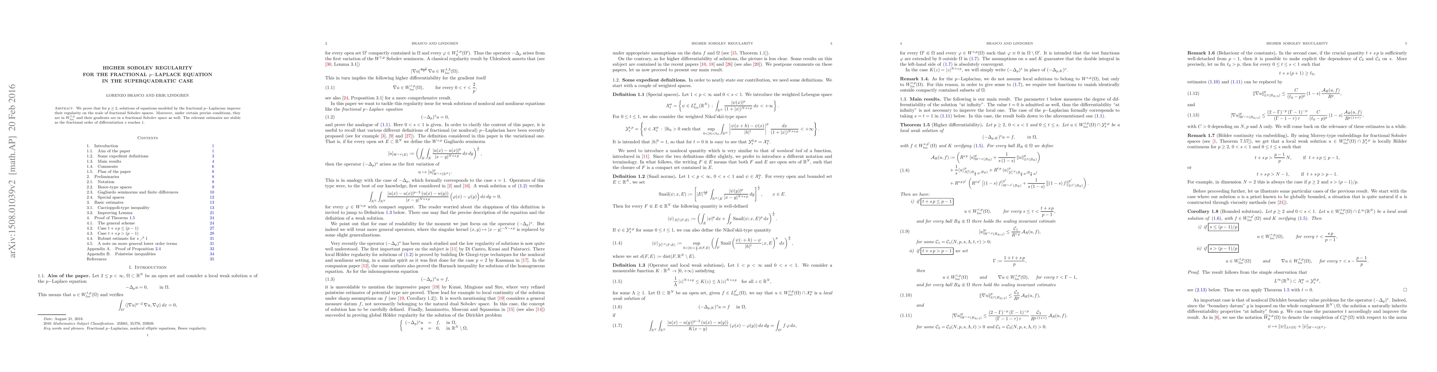 We prove that for $p\ge 2$ solutions of equations modeled by the fractional $p$-Laplacian improve their regularity on the scale of fractional Sobolev spaces. Moreover, under certain precise conditions, they are in $W^{1,p}_{loc}$ and their gradients are in a fractional Sobolev space as well. The relevant estimates are stable as the fractional order of differentiation $s$ reaches $1$.