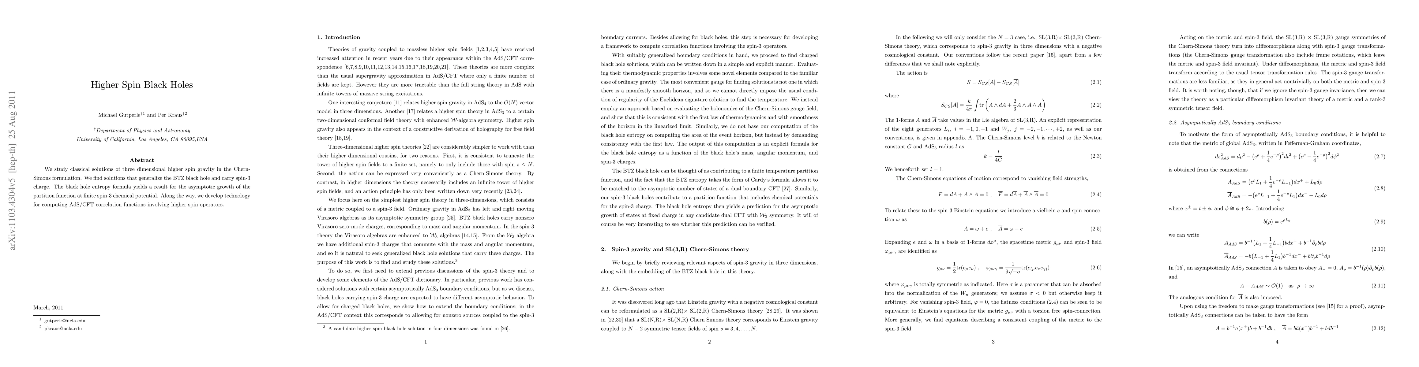 This paper investigates three-dimensional higher spin gravity, discovering new solutions that extend the BTZ black hole with spin-3 charge, and develops methods for computing AdS/CFT correlation functions for higher spin operators. The study also provides an entropy formula for the asymptotic growth of the partition function under finite spin-3 chemical potential.