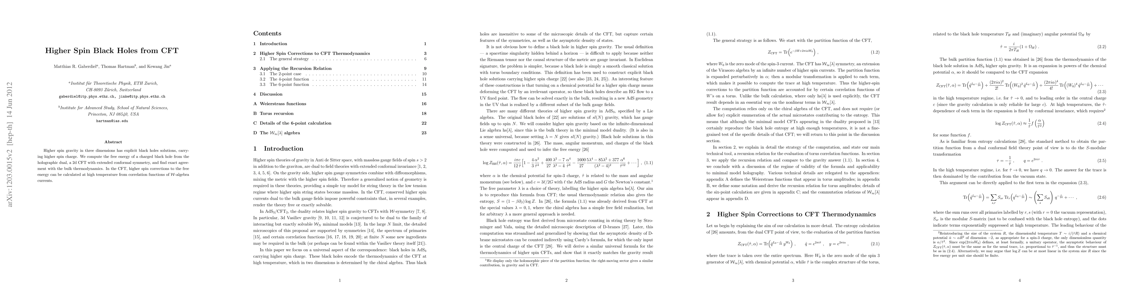 This paper explores higher spin black holes in three-dimensional gravity, deriving their free energy from the holographic dual, a 2d conformal field theory (CFT) with extended symmetry. The computed free energy matches the bulk thermodynamic predictions, confirming higher spin corrections through high-temperature correlation functions of W-algebra currents.