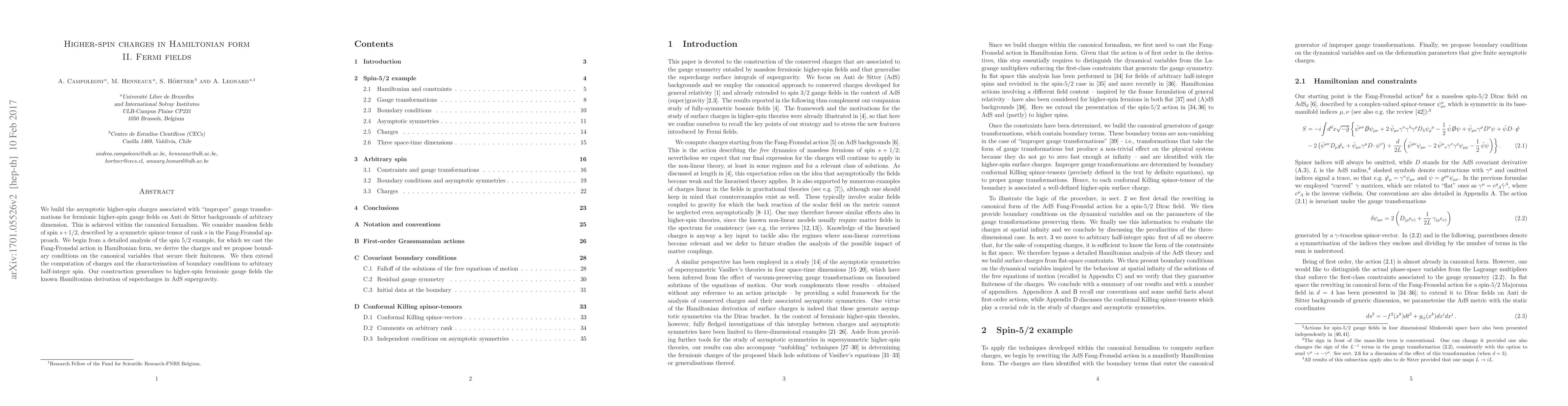We build the asymptotic higher-spin charges associated with "improper" gauge transformations for fermionic higher-spin gauge fields on Anti de Sitter backgrounds of arbitrary dimension. This is achieved within the canonical formalism. We consider massless fields of spin s+1/2, described by a symmetric spinor-tensor of rank s in the Fang-Fronsdal approach. We begin from a detailed analysis of the spin 5/2 example, for which we cast the Fang-Fronsdal action in Hamiltonian form, we derive the charges and we propose boundary conditions on the canonical variables that secure their finiteness. We then extend the computation of charges and the characterisation of boundary conditions to arbitrary half-integer spin. Our construction generalises to higher-spin fermionic gauge fields the known Hamiltonian derivation of supercharges in AdS supergravity.