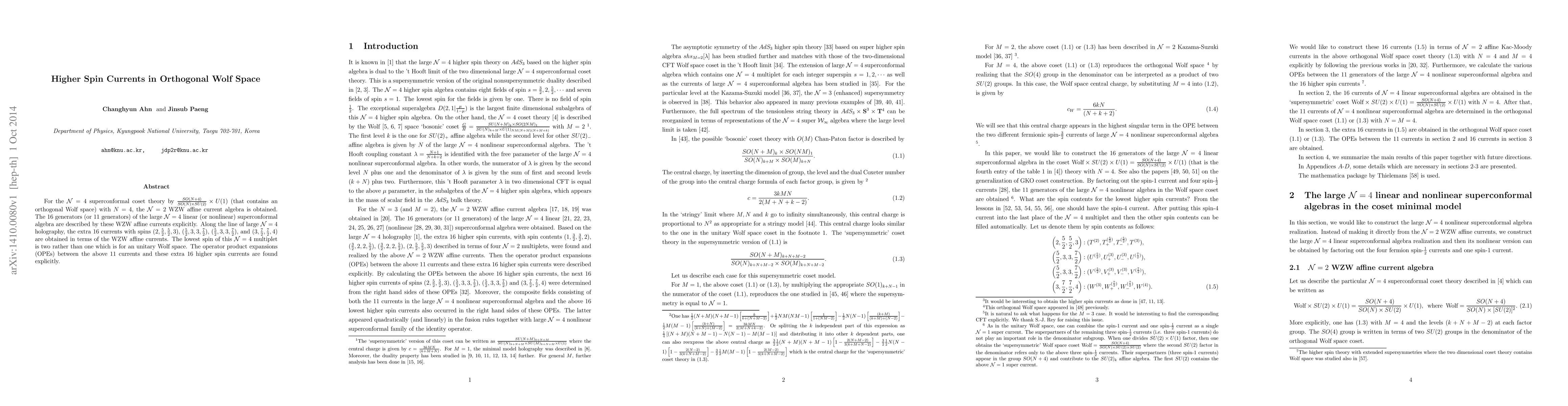 For the N=4 superconformal coset theory by [SO(N+4)/SO(N) x SU(2)] x U(1) (that contains an orthogonal Wolf space) with N=4, the N=2 WZW affine current algebra is obtained. The 16 generators (or 11 generators) of the large N=4 linear (or nonlinear) superconformal algebra are described by these WZW affine currents explicitly. Along the line of large N=4 holography, the extra 16 currents with spins (2,5/2,5/2, 3), (5/2, 3, 3, 7/2), (5/2, 3, 3, 7/2), and (3, 7/2, 7/2, 4) are obtained in terms of the WZW affine currents. The lowest spin of this N=4 multiplet is two rather than one which is for an unitary Wolf space. The operator product expansions (OPEs) between the above 11 currents and these extra 16 higher spin currents are found explicitly.