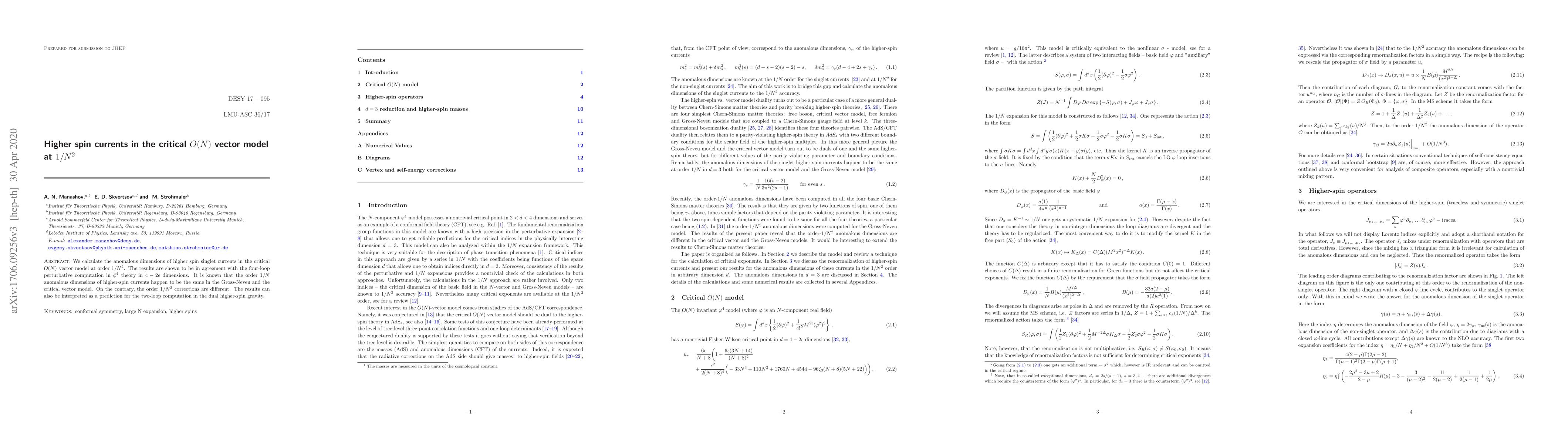 This study calculates the $1/N^2$ order anomalous dimensions of higher spin singlet currents in the critical $O(N)$ vector model, confirming agreement with four-loop perturbative computations in $\phi^4$ theory. It highlights the difference in $1/N^2$ corrections between the Gross-Neveu model and the critical vector model, with implications for dual higher-spin gravity computations.