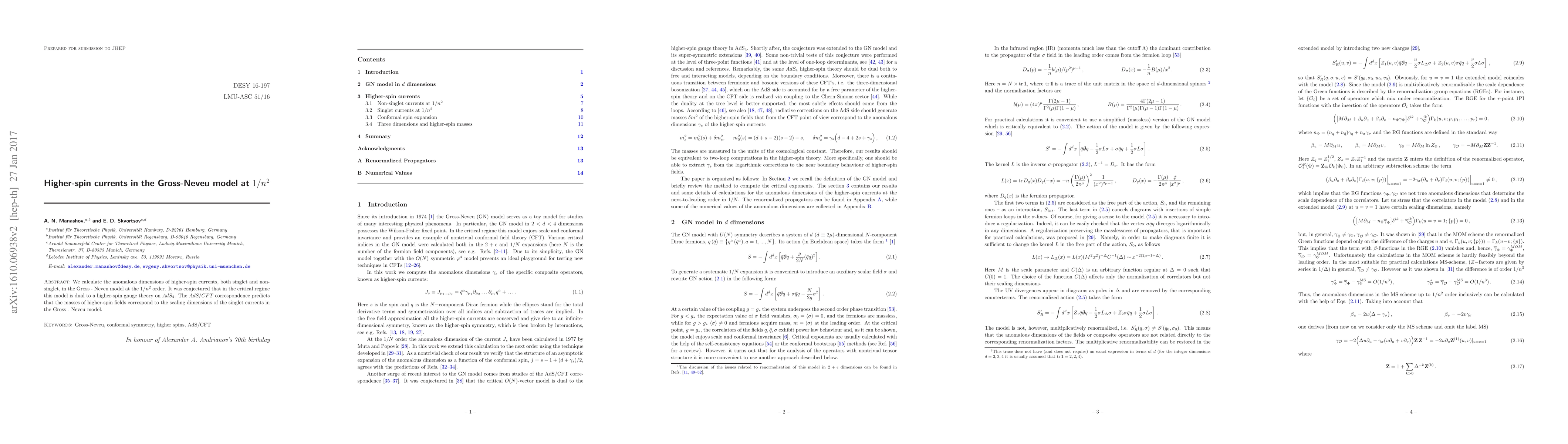 This paper calculates the anomalous dimensions of higher-spin currents in the Gross-Neveu model at $1/n^2$ order, supporting the conjecture of its dual relationship to a higher-spin gauge theory in $AdS_4$ via the $AdS/CFT$ correspondence. The findings align with predictions that the masses of higher-spin fields correspond to the scaling dimensions of singlet currents in the model.