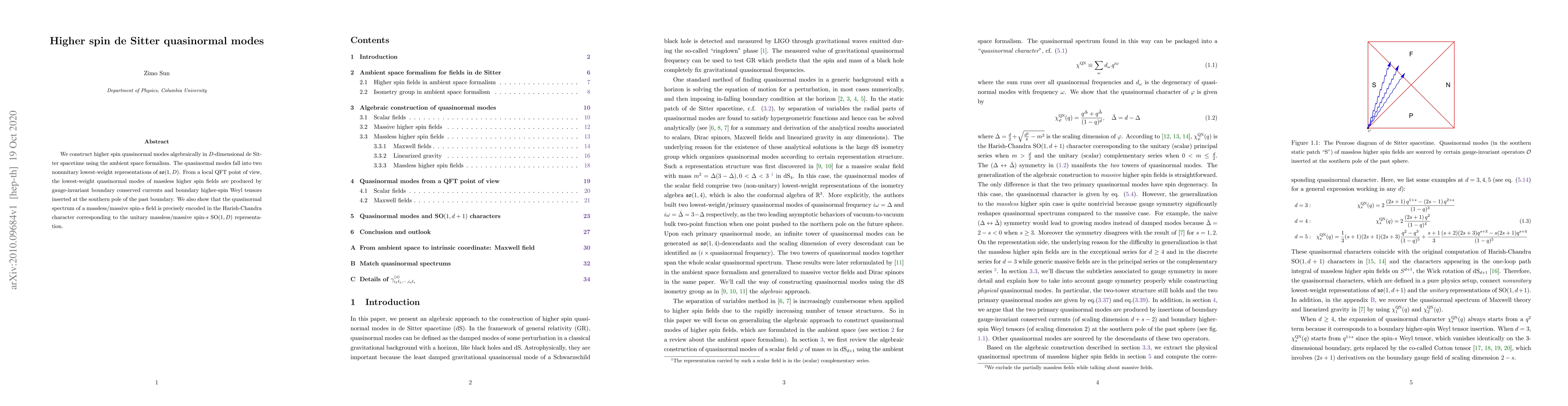This paper constructs higher spin quasinormal modes in $D$-dimensional de Sitter spacetime using the ambient space formalism, revealing two nonunitary lowest-weight representations of $\mathfrak{so}(1, D)$. It also demonstrates that the quasinormal spectrum of massless/massive spin-$s$ fields corresponds to the Harish-Chandra character of the respective $\text{SO}(1, D)$ representation.