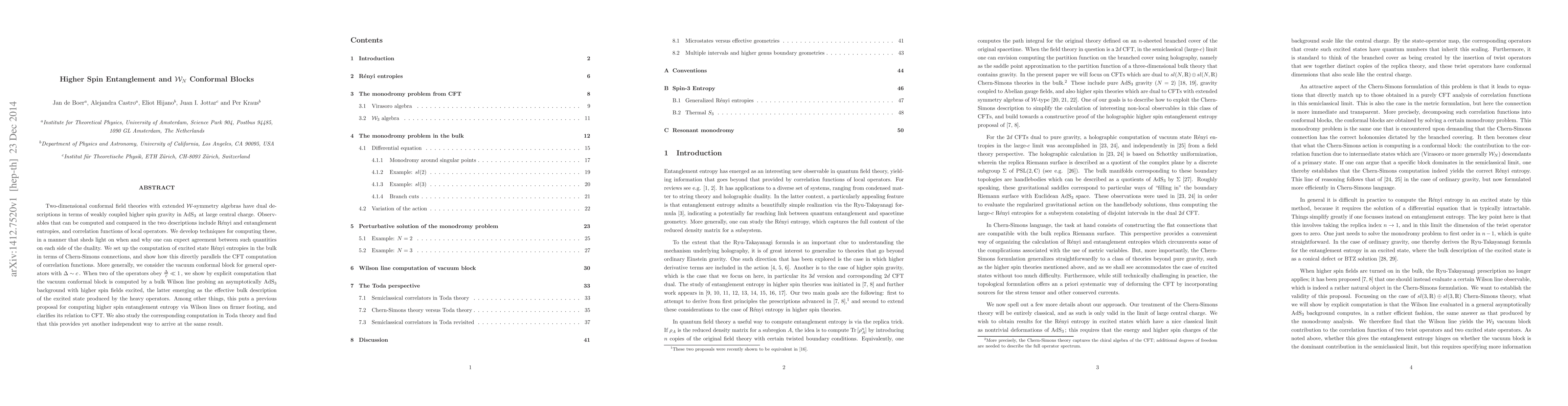 This paper explores the duality between two-dimensional conformal field theories with extended $\mathcal{W}$-symmetry and weakly coupled higher spin gravity in AdS$_3$. It develops techniques to compute entanglement entropies and correlation functions, showing that bulk Wilson lines in higher spin gravity provide an effective description of excited states in the CFT.