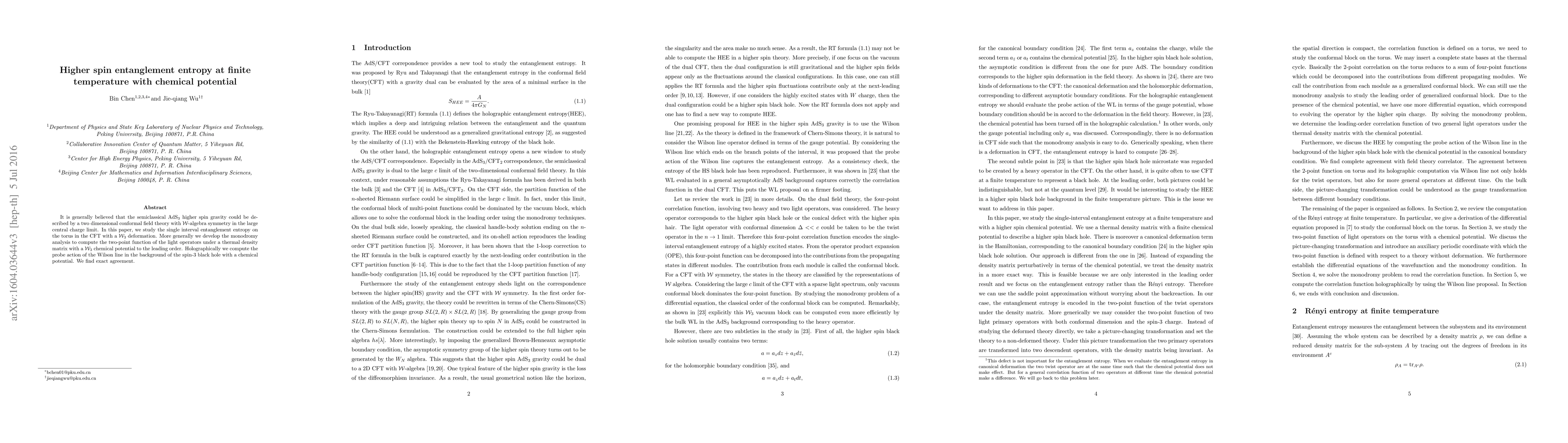 It is generally believed that the semiclassical AdS$_3$ higher spin gravity could be described by a two dimensional conformal field theory with ${\cal{W}}$-algebra symmetry in the large central charge limit. In this paper, we study the single interval entanglement entropy on the torus in the CFT with a ${\cW}_3$ deformation. More generally we develop the monodromy analysis to compute the two-point function of the light operators under a thermal density matrix with a ${\cW}_3$ chemical potential to the leading order. Holographically we compute the probe action of the Wilson line in the background of the spin-3 black hole with a chemical potential. We find exact agreement.