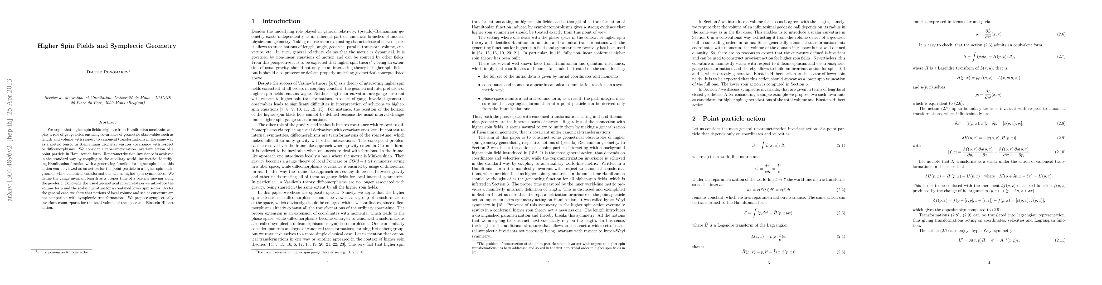 This paper explores how higher spin fields emerge from Hamiltonian mechanics and function as gauge fields ensuring covariance of geometric observables under canonical transformations, analogous to the role of a metric tensor in Riemannian geometry. It proposes symplectically invariant counterparts for volume and the Einstein-Hilbert action, highlighting the incompatibility of local volume and scalar curvature with symplectic transformations.