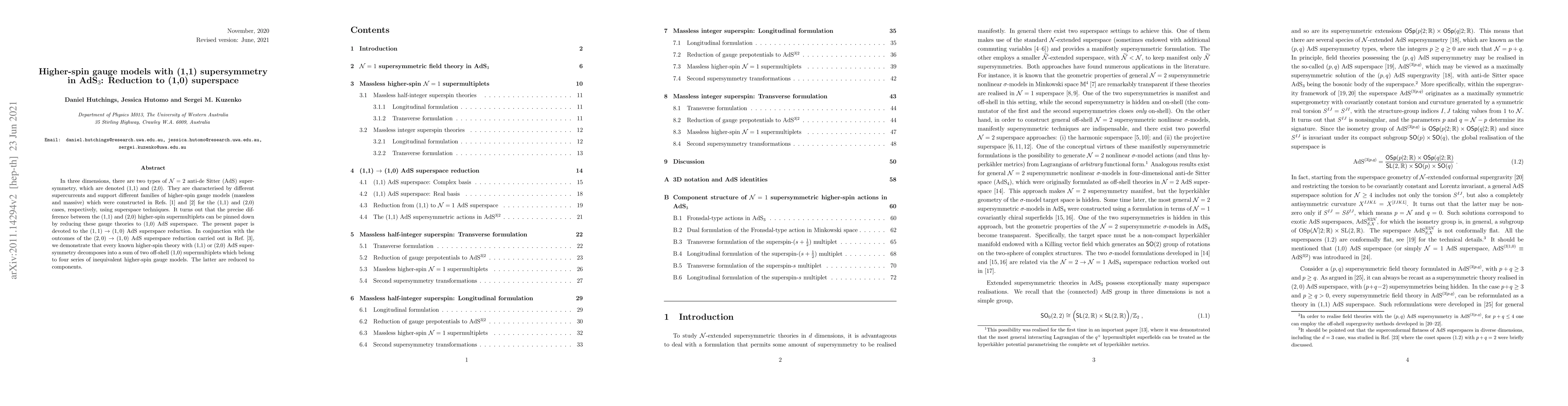This paper explores the reduction of higher-spin gauge models with (1,1) supersymmetry in AdS₃ to (1,0) superspace, revealing that these models decompose into two off-shell (1,0) supermultiplets, fitting into four distinct series of higher-spin gauge theories. This reduction complements prior work on (2,0) supersymmetry, establishing a comprehensive framework for all known higher-spin theories in AdS₃.