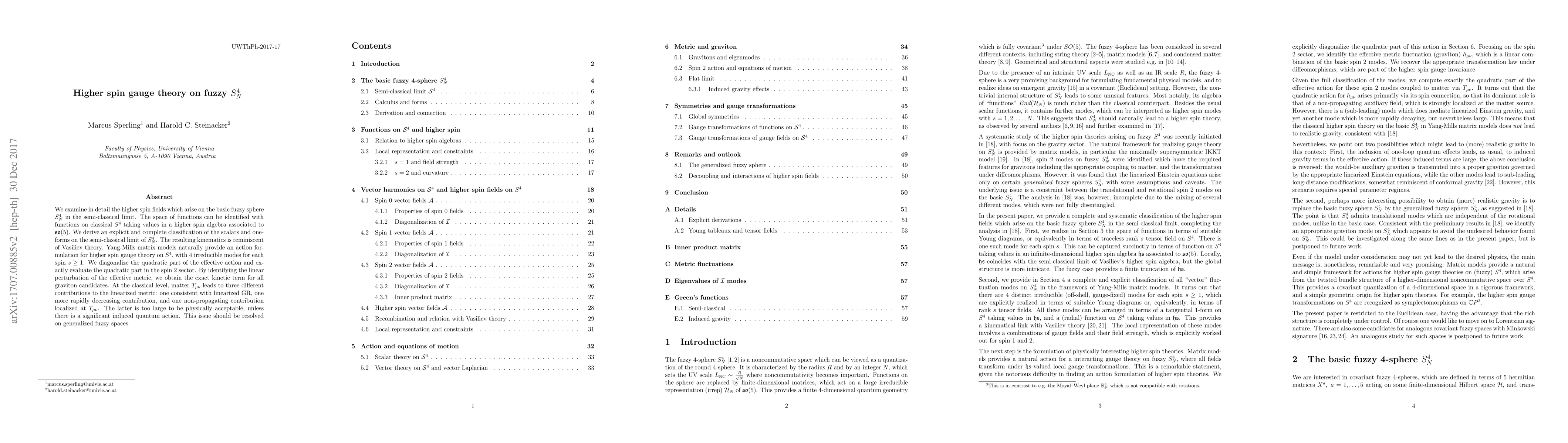 This paper classifies higher spin fields on the fuzzy sphere $S^4_N$ and derives their kinematics, resembling Vasiliev theory. It evaluates the quadratic part of the effective action for spin 2 fields and identifies issues with non-propagating contributions in the classical metric, suggesting the need for a quantum correction.