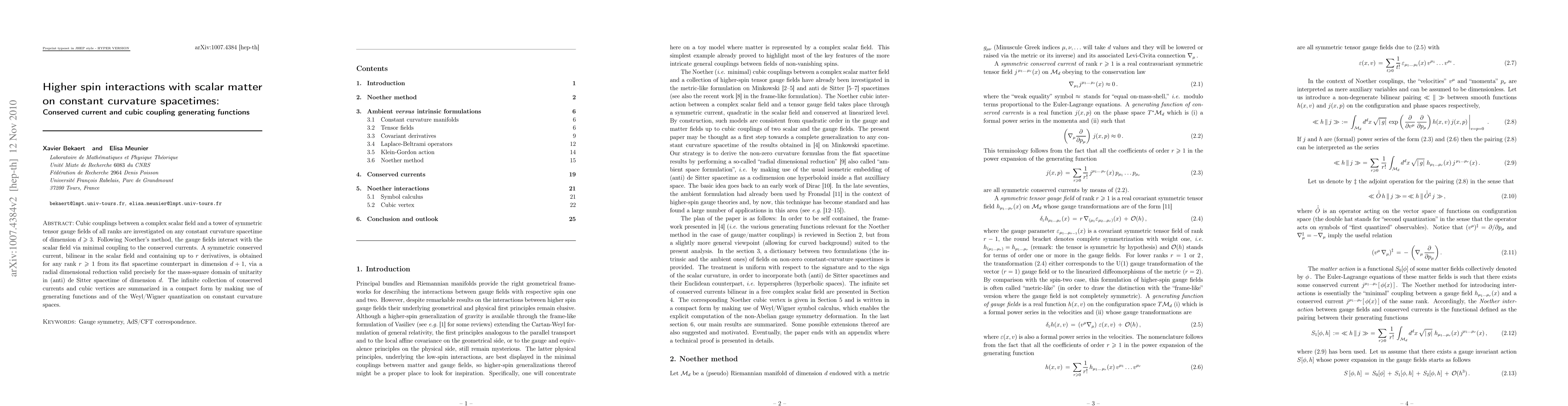 This paper investigates cubic couplings between a complex scalar field and symmetric tensor gauge fields on constant curvature spacetimes, finding compact generating functions for conserved currents and vertices.